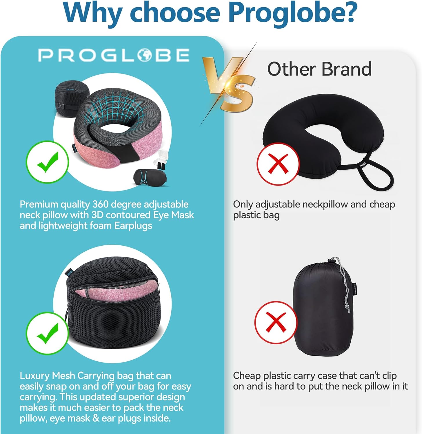 Pink Airplane Travel Pillow Set, 100% Pure Memory Foam Neck Pillow, Updated Material, Long Flight Travel Kit with 3D Contoured Eye Masks, Earplugs, and Luxury Bag