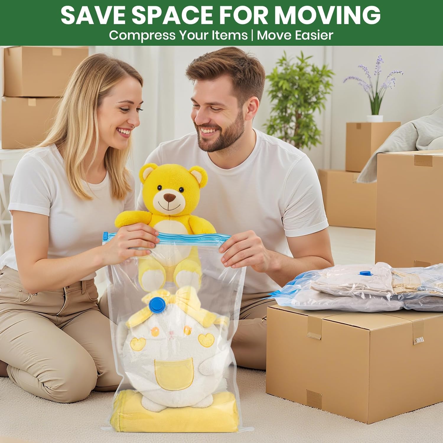 - Save Up to 80% Closet and Luggage Space-Say goodbye to clutter with our premium vacuum storage bagsâthey compress bulky items like comforters, pillows, and winter coats down to just 20% of their original size. Whether you're organizing your wardrobe,moving house or packing for a trip, these compression bags are the closet space savings and perfect space saving vacuum storage bags for tight spaces at home or on the go. Great as vacuum seal bags for clothing.
