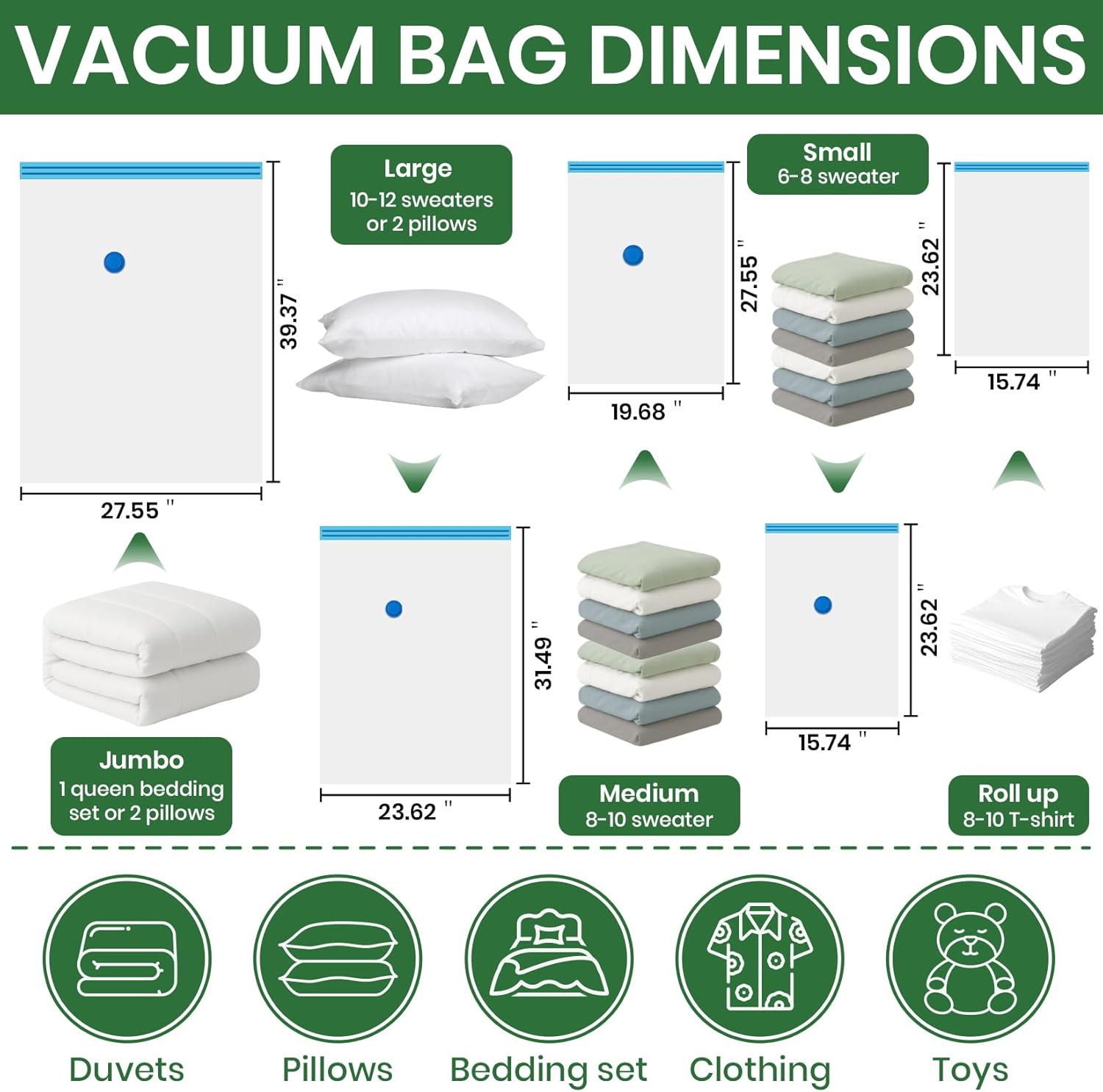 - All-in-One 20-Bag Set-Youâll get 4 jumbo(27.55" x 39.37" ) vacuum storage bags, 4 large(23.62" x 31.49" ) vacuum seal bags for bedding, 4 medium(19.68" x 27.55" ), 4 small(15.74" x 23.62" ), and 4 travel roll-up(15.74" x 23.62" ) space saving bagsâa complete solution for organizing everything from seasonal clothes to oversized bedding. Ideal for blanket storage, these bags also work as vacuum bags for comforters and are reliable vacuum bags for travel.