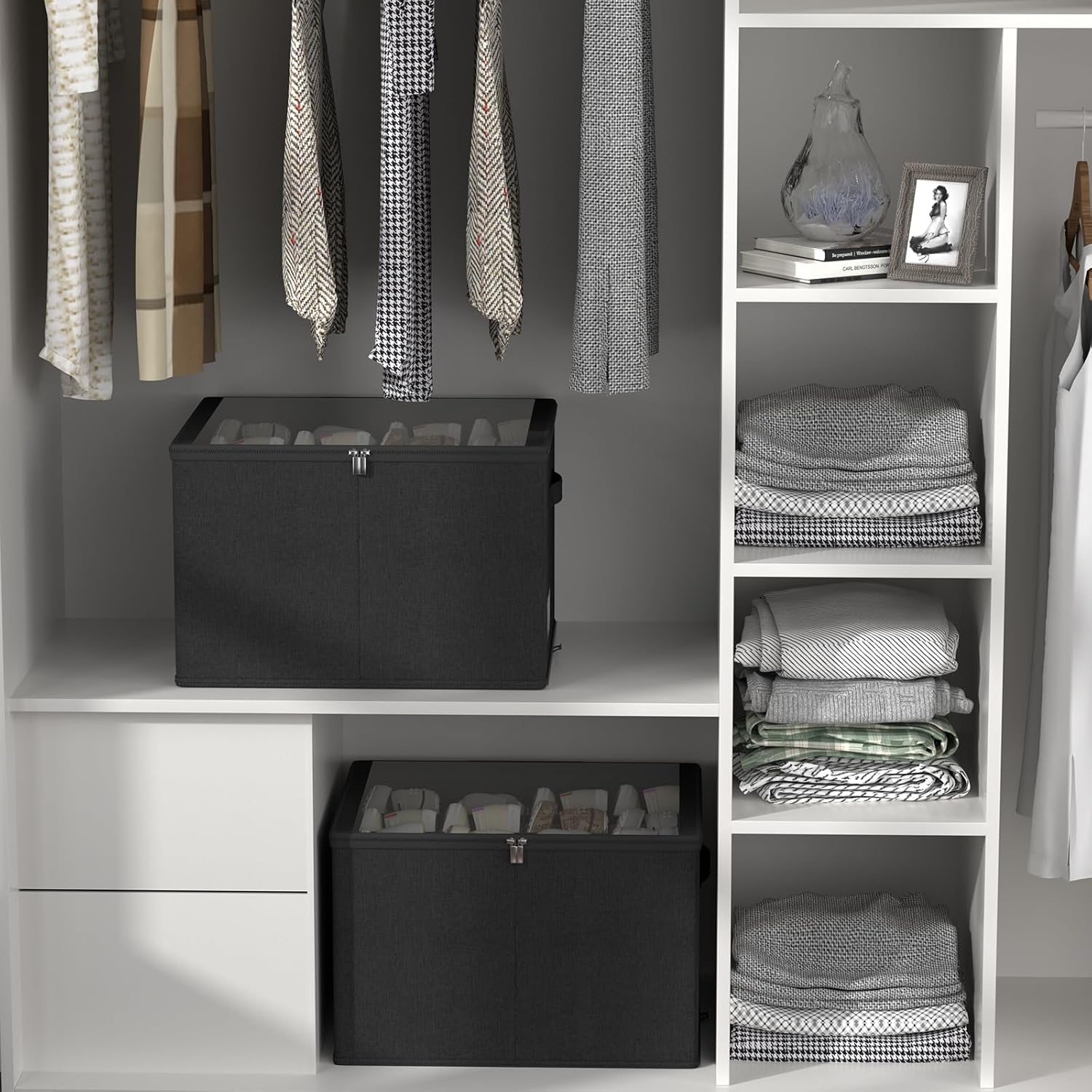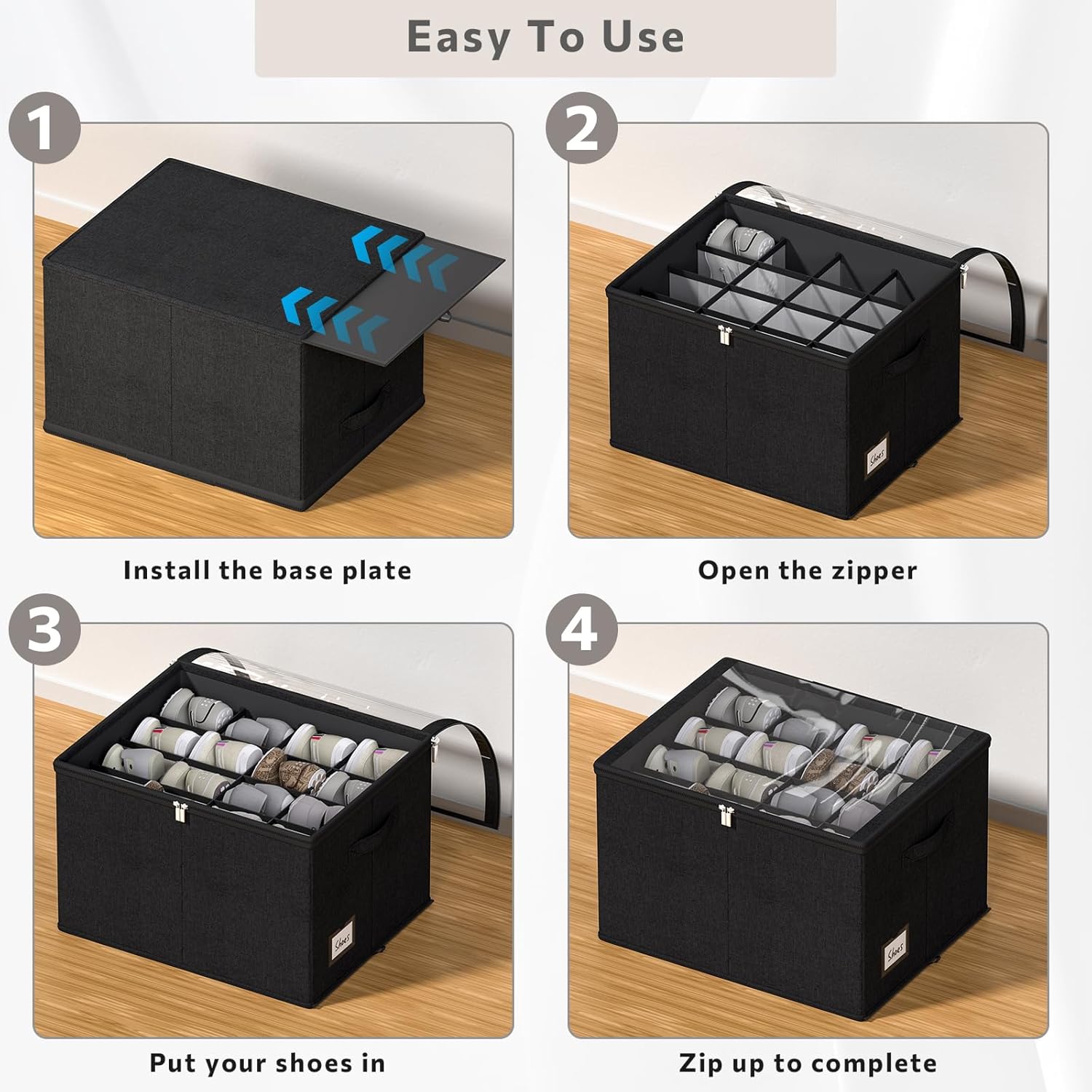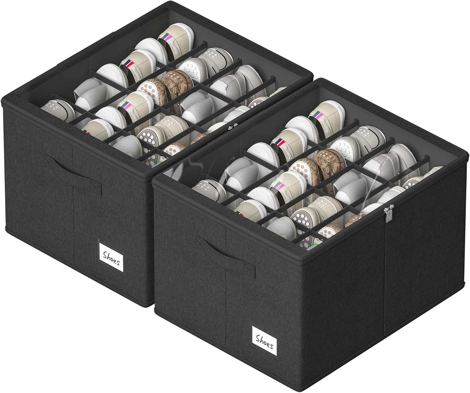 Shoe Organizer for Closet, 2 Pack Sturdy Shoe Storage Bins with Clear Cover, Fits 16-32 Pairs, Foldable Shoe Storage Box with Reinforced Handles (Black, 19.7 * 15.7 * 12.6in)
