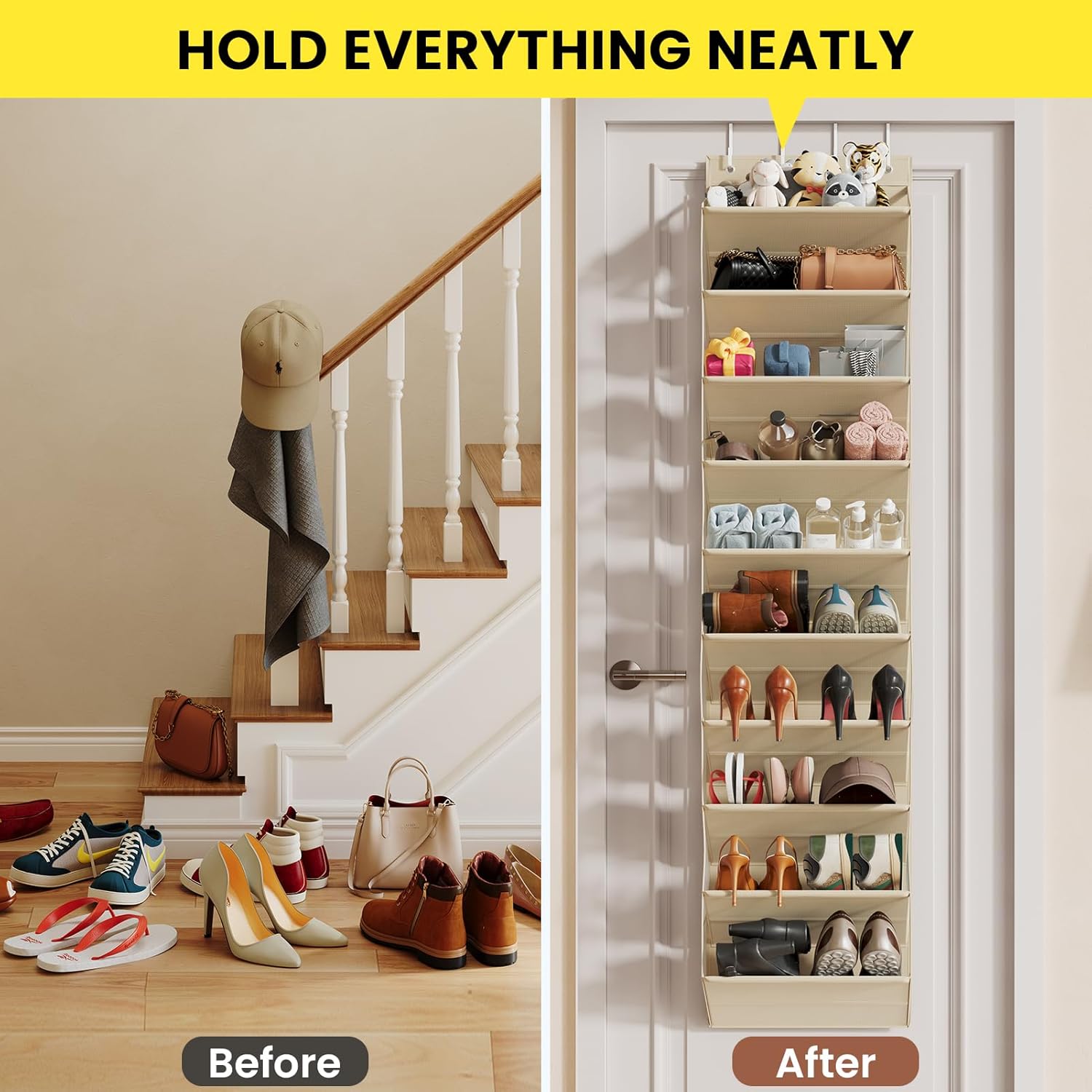 - 10 Tier Extra-Large & Deep Compartments: Our over-the-door shoe organizer features 10 Tier large and deep pockets, designed to hold 20-40 pairs of shoes. Effortlessly store 20 bulky size 12+ boots, heels, sandals, or flip-flops. Offers 40% more capacity than standard organizers