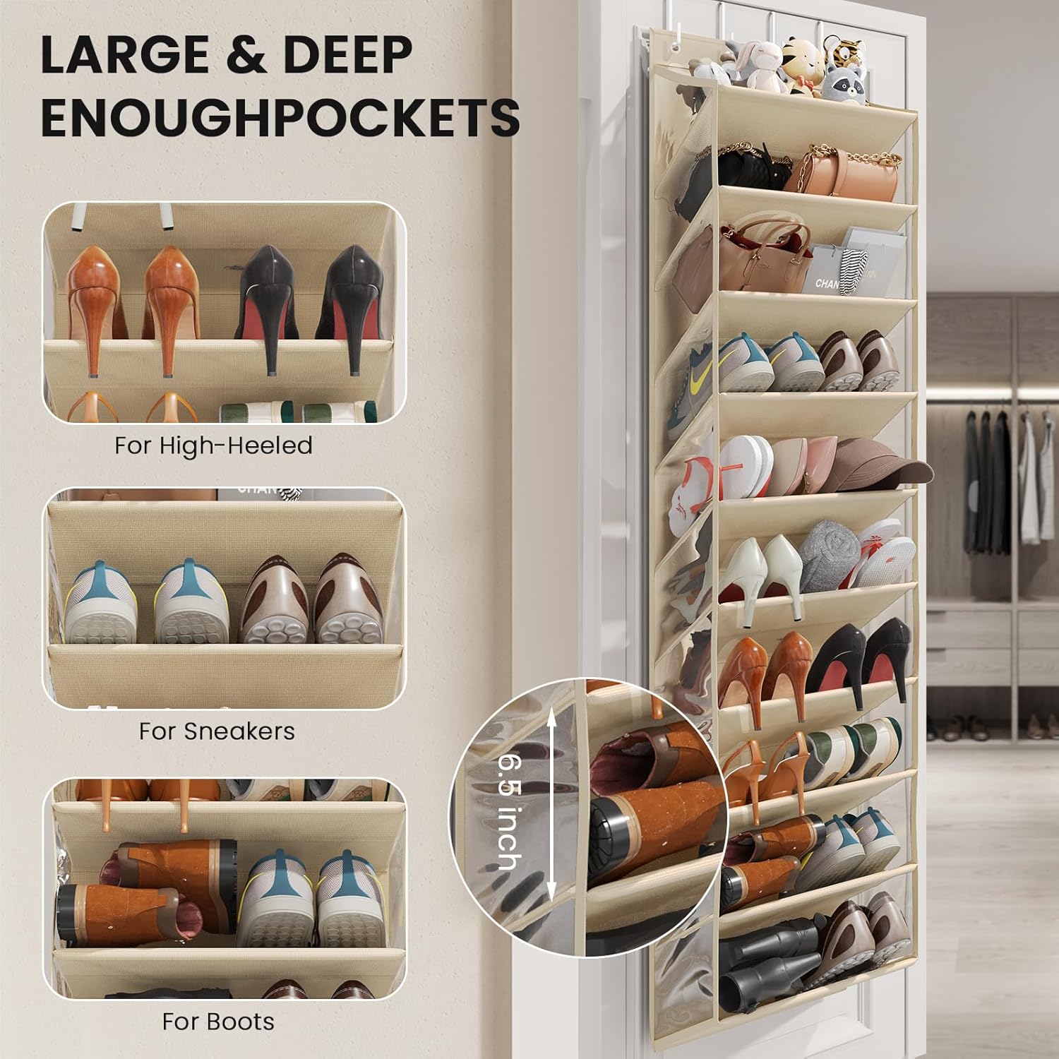 Over the Door Shoe Organizer for Closet, Shoes Rack with 10 Tier PVC Window Deep Pockets, Hanging Shoe Organizers for Boot Storage, Behind the Door Narrow Shoe Holder for Small Shoes, Beige
