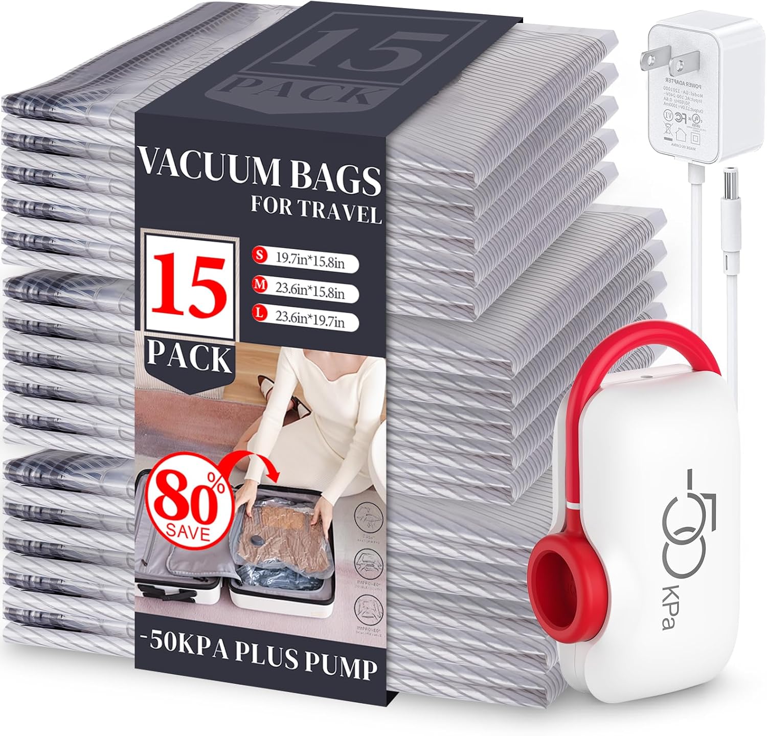 VMstr 15 Pack Travel Vacuum Storage Bags With High Pressure Electric Pump(D/C Power), Compression Sealing for Clothes and Clothing Luggage Suitcase Packing, Carry-on Travel Size