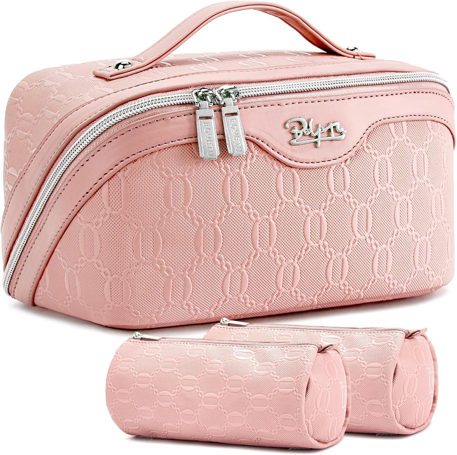 BOYATU Travel Makeup Bag for Women: Cosmetic Organizer Bag with Compartments - Leather Make up Bags Set of 3 (Pink)
