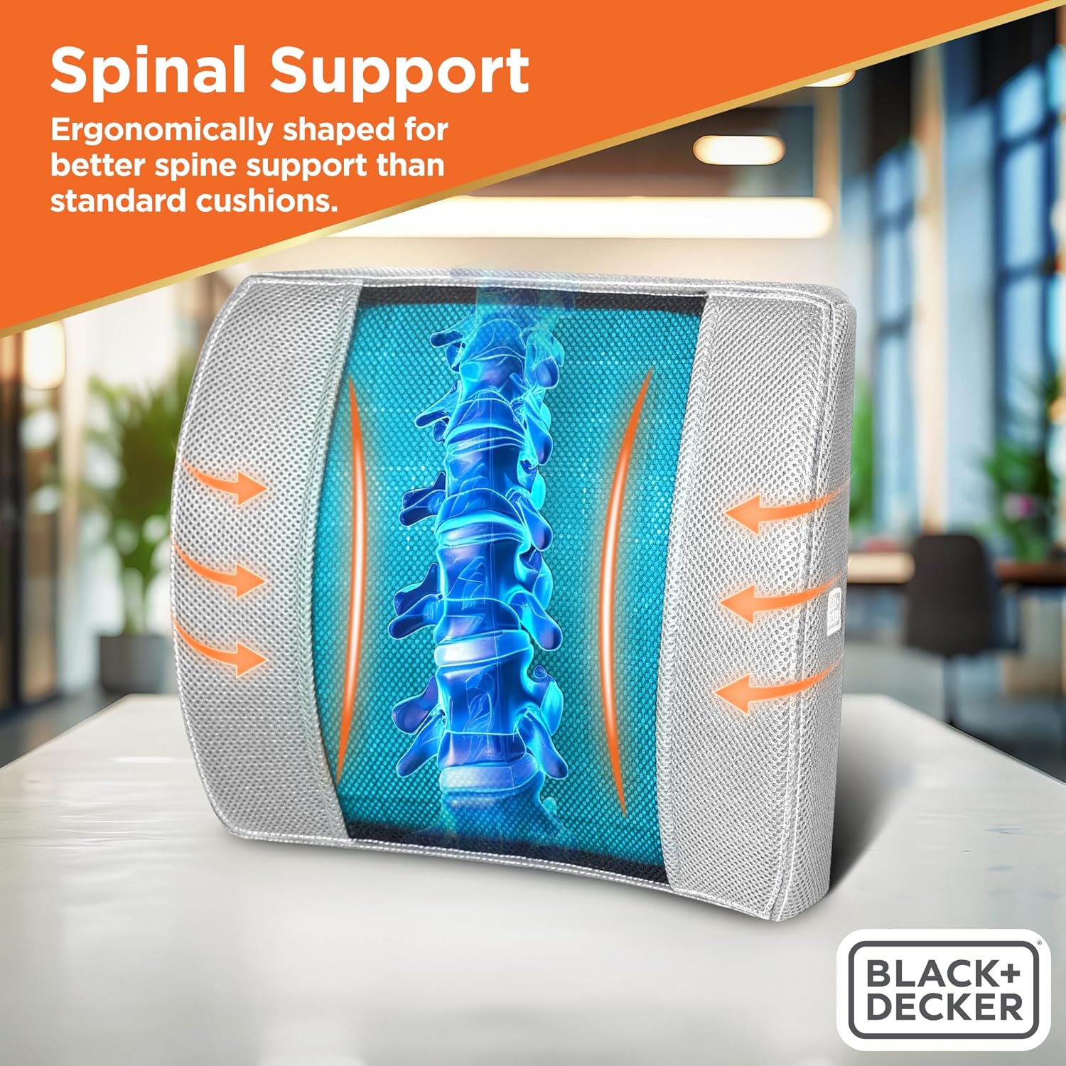 - Ergonomic Lumbar Support for Maximum Comfort – The BLACK+DECKER Cooling Gel Lumbar Memory Foam Cushion provides contoured support to help alleviate lower back pain and promote proper posture, whether you’re working, driving, or relaxing. Dimensions: 13.6 x 12.8 x 4.1 inches.