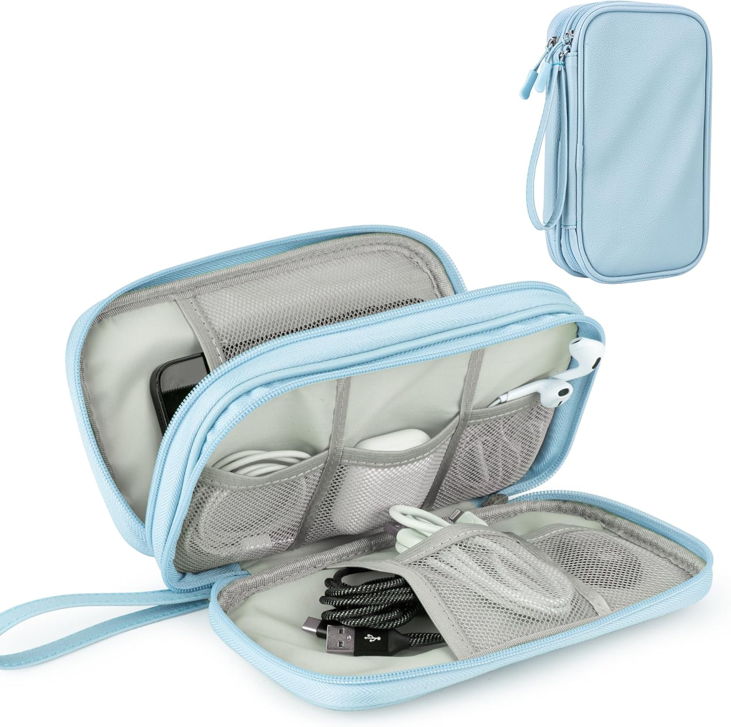 Leather Travel Electronic Organizer - Double Layer, Waterproof Case for Cables, Chargers, Phones & More - Portable, Shockproof Pouch for All Your Electronics Accessories (Light Blue, M)