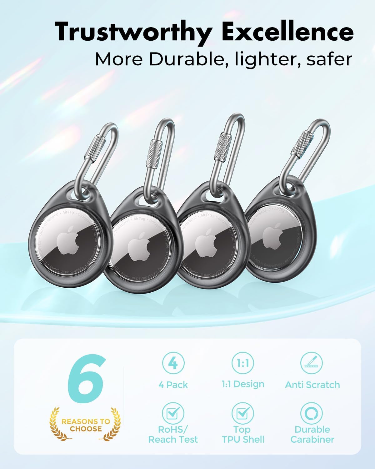 UNBREAKcable AirTag Holder for Apple - 4 Pack Air Tag Case [Professional Carabiner] [Waterproof] [Shockproof] TPU AirTag Keychain for Kids, Pets, Keys, Luggage, Backpacks