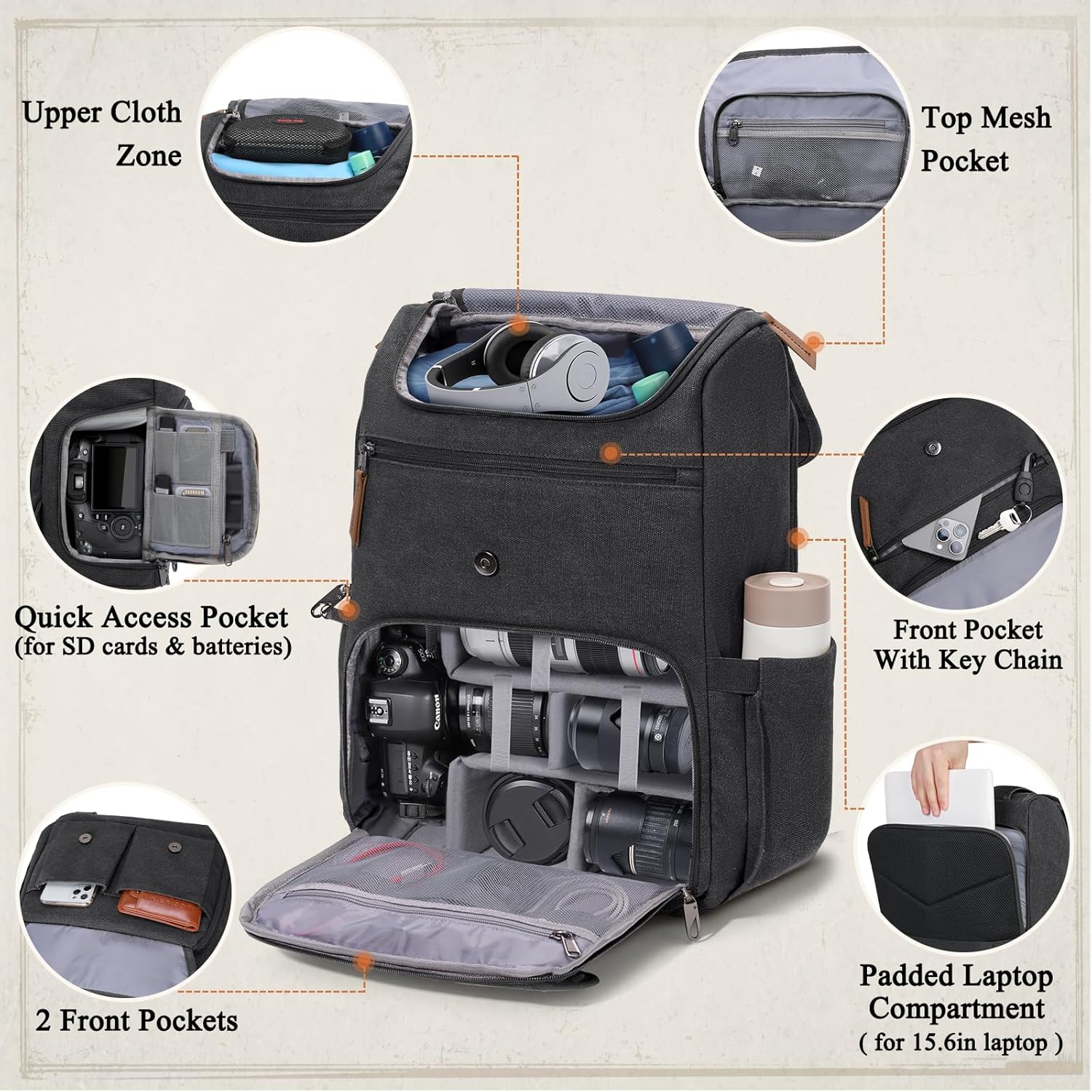 - SUPERIOR CAMERA PROTECTION: Made from water-resistant and scratch-resistant canvas, equipped with a waterproof rain cover, this waterproof camera backpack provides dual protection for your precious photography accessories from any unexpected weather. Soft velvet lining and 360°padded cushioning of the photography backpack ensure shock absorption and safeguard cameras, lenses, flash from impacts, scratches, and other potential damages.