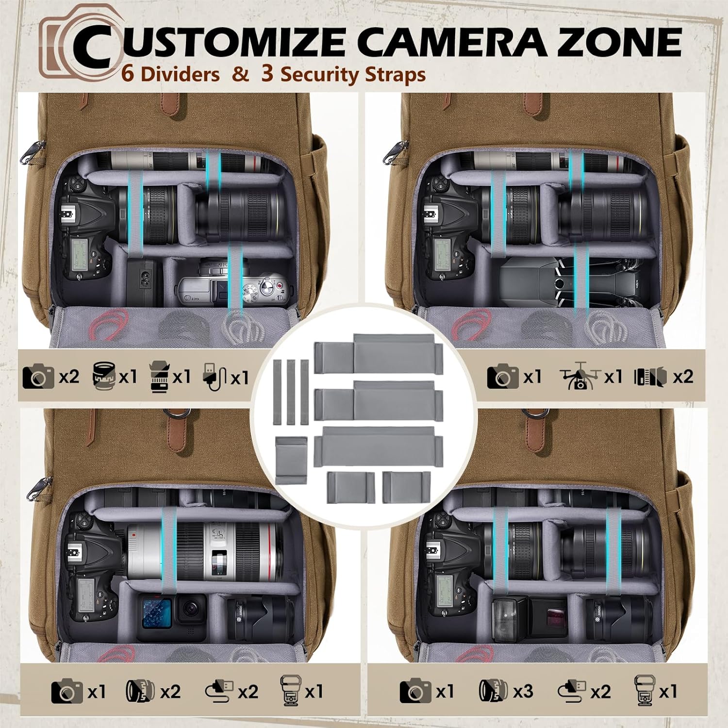 - SUPERIOR CAMERA PROTECTION: Made from water-resistant and scratch-resistant canvas, equipped with a waterproof rain cover, this waterproof camera backpack provides dual protection for your precious photography accessories from any unexpected weather. Soft velvet lining and 360°padded cushioning of the photography backpack ensure shock absorption and safeguard cameras, lenses, flash from impacts, scratches, and other potential damages.