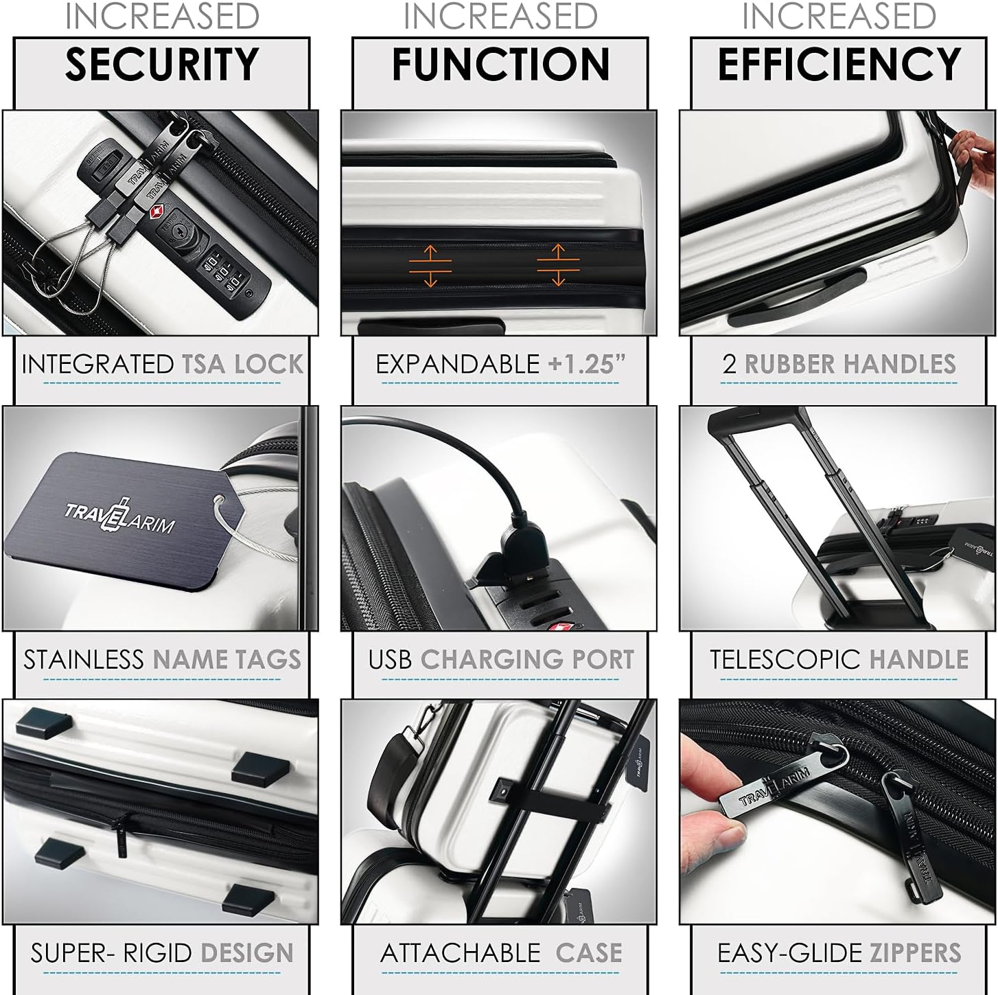 - Carryon Luggage with Spinner Wheels: Rolling carry on luggage for plane travel includes 4 spinner wheels that provide you with smooth, gliding 360 movement, a telescoping handle, stainless steel name tags, and TSA lock to secure your belongings.