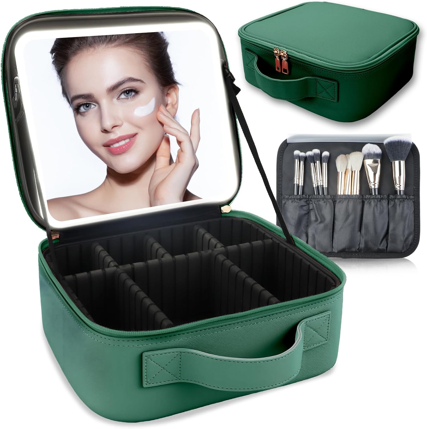 Makeup Bag with Led Mirror,Travel Makeup Organizer with 3 Color Setting, Portable Storage and Adjustable Dividers Travel Makeup Bag(Dark green)