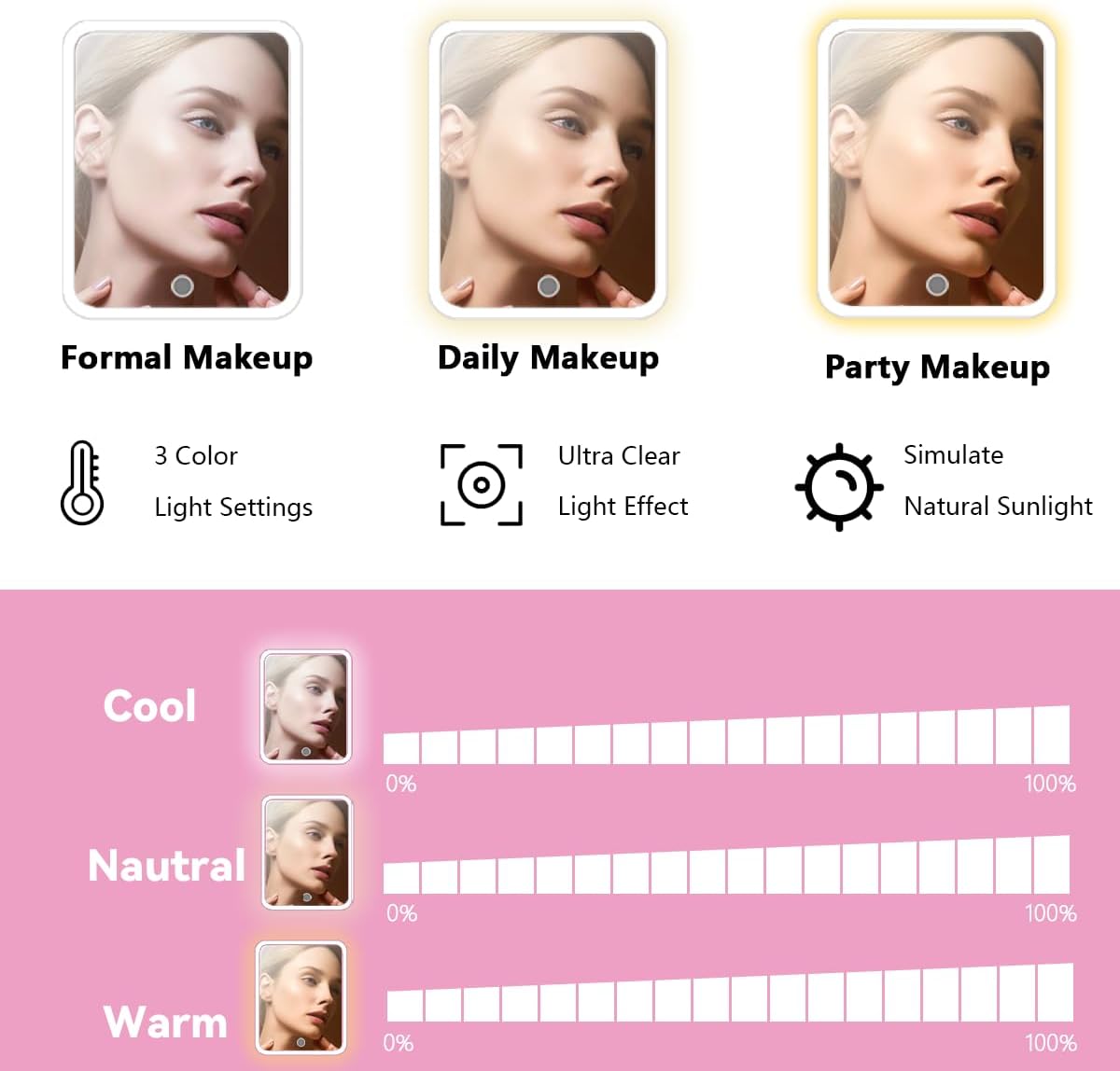 - 【Removable & Adjustable brightness High Definition LED mirror】:3 lighting modes and 0-100% adjustable brightness that can be switched. With a long press on the switch, and a short press can adjust the color temperature between cool, natural and warm light.The makeup mirror is firmly attached to the makeup bag by Velcro and can be disassembled for separate use, and the makeup mirror comes with a separate stand that can be conveniently placed on the table according to your needs.