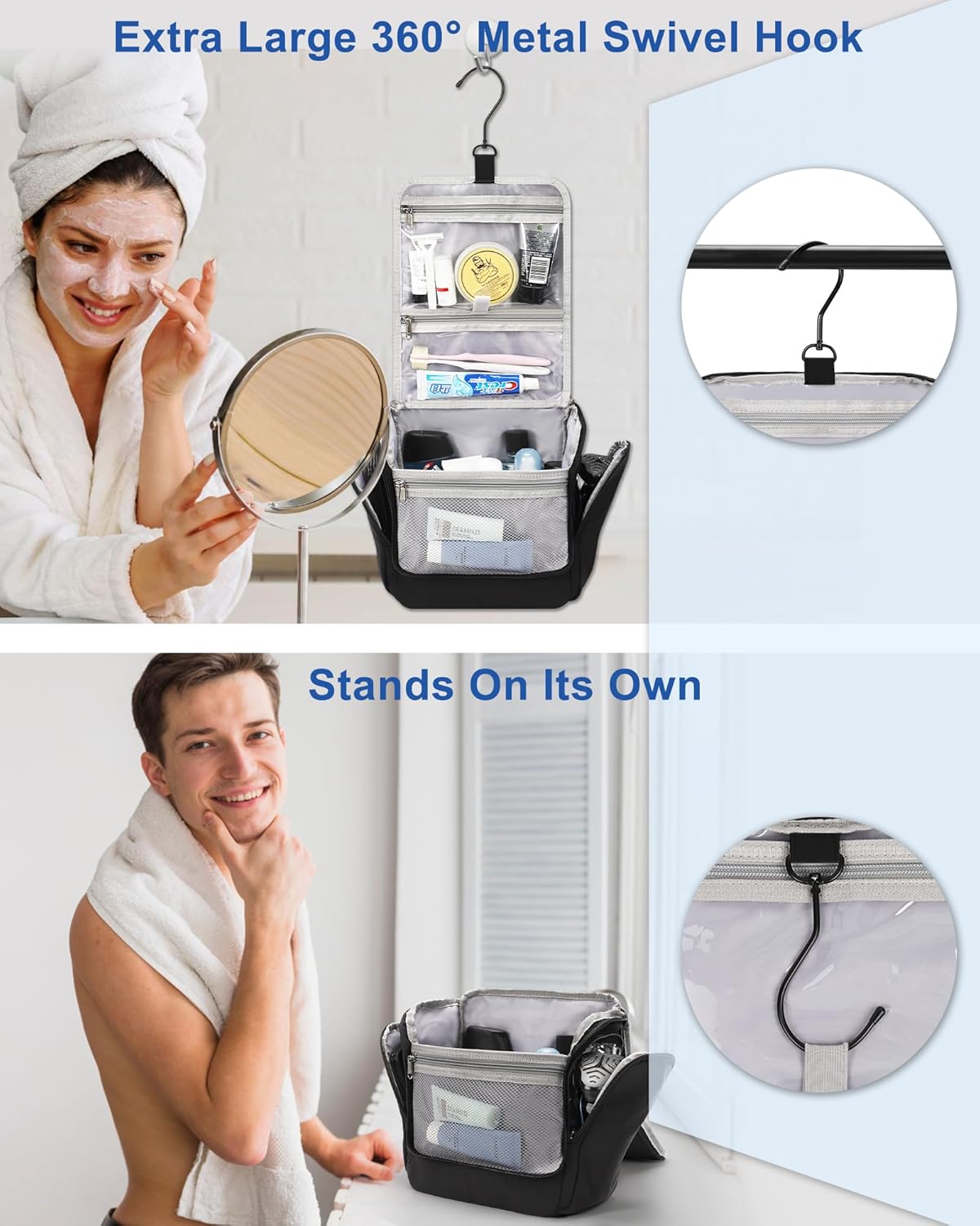 - Convenient Hanging Hook: Comes with a extra large 360° metal swivel hanging hook, big enough allows you to hang the bag anywhere. Keeps its shape when hanging, easy access. More rationalized design than the same type of toiletry bag on the market.