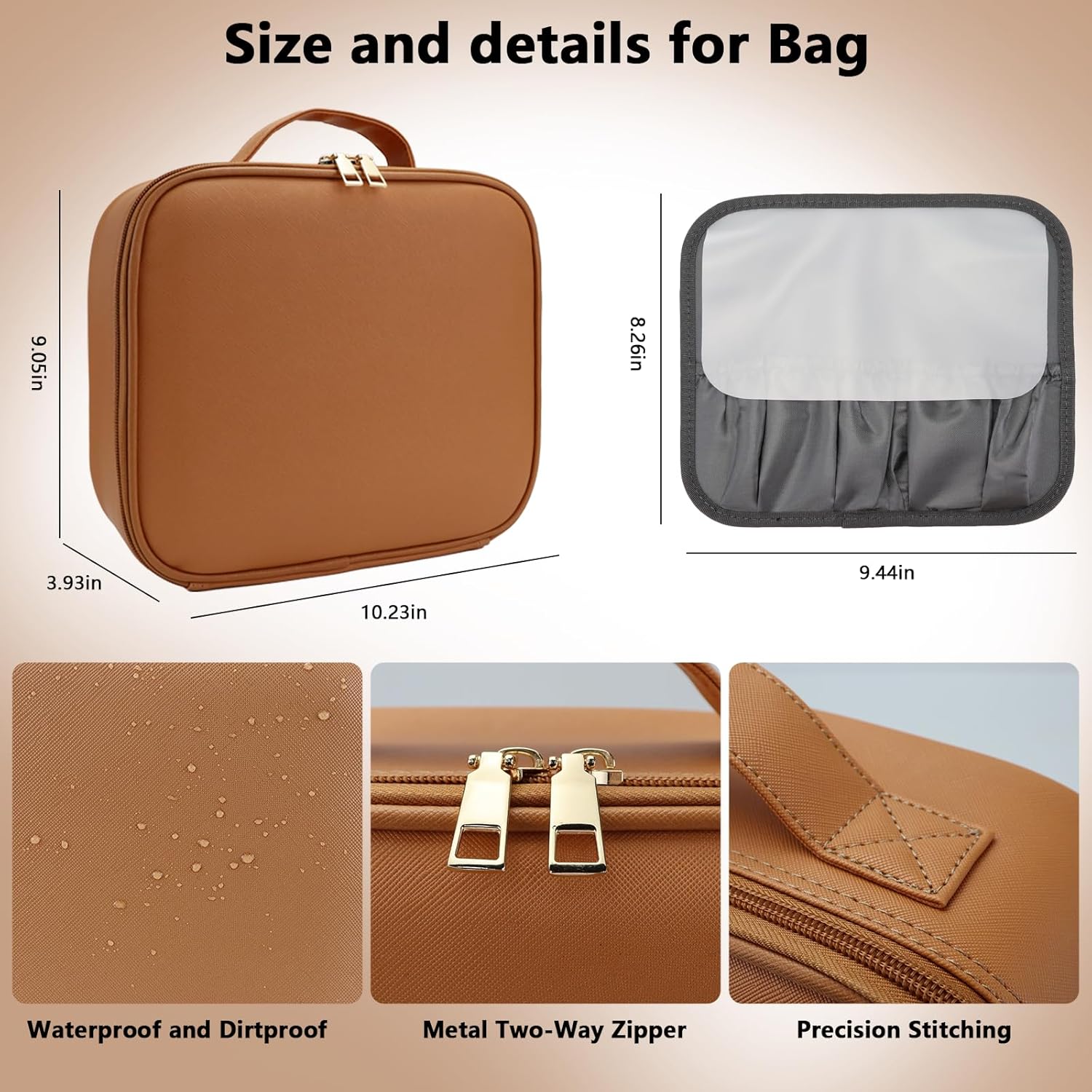 - 【Portable Dressing Table】The large capacity travel makeup bag with LED mirror size is 10.23*9.05*3.93 inch. It is made of high-quality PU leather, which is waterproof, easy to clean, durable and wear-resistant. The zipper system is made to a high standard to ensure smooth pulling.