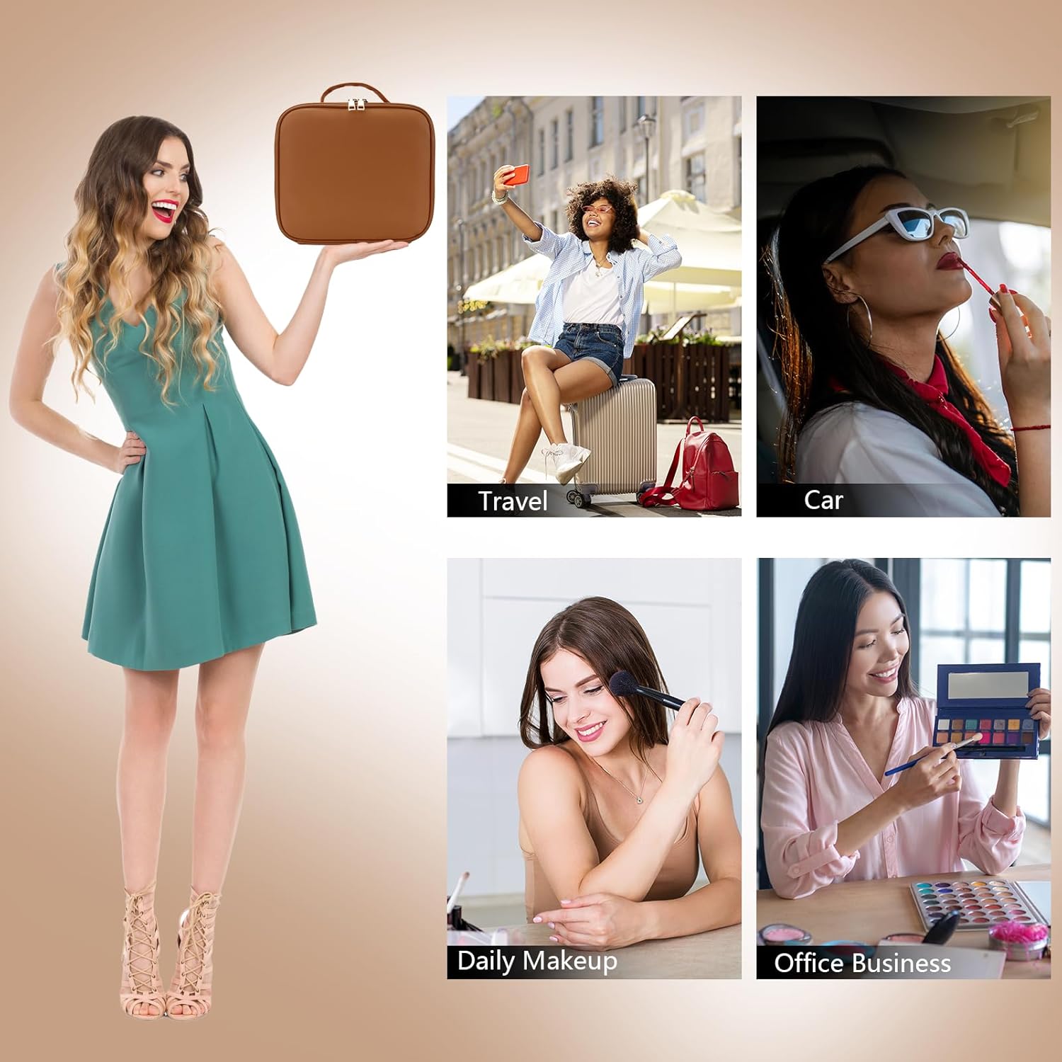 Travel Makeup Bag with LED Mirror Travel Makeup Organizer with 3 Lighted Settings, Adjustable Dividers and Makeup Brush Storage Bag Caramel