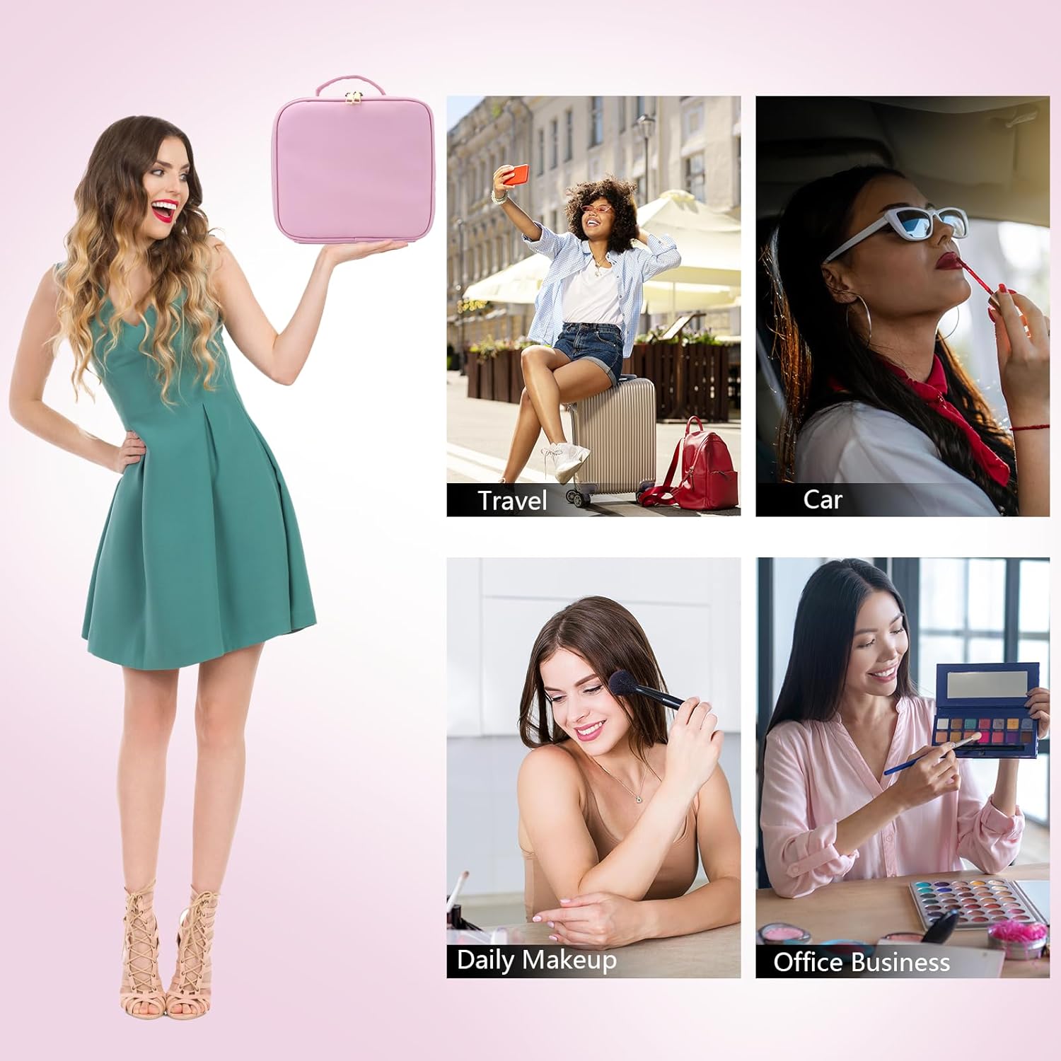 Travel Makeup Bag with LED Mirror Travel Makeup Organizer with 3 Lighted Settings, Adjustable Dividers and Makeup Brush Storage Bag Light Pink