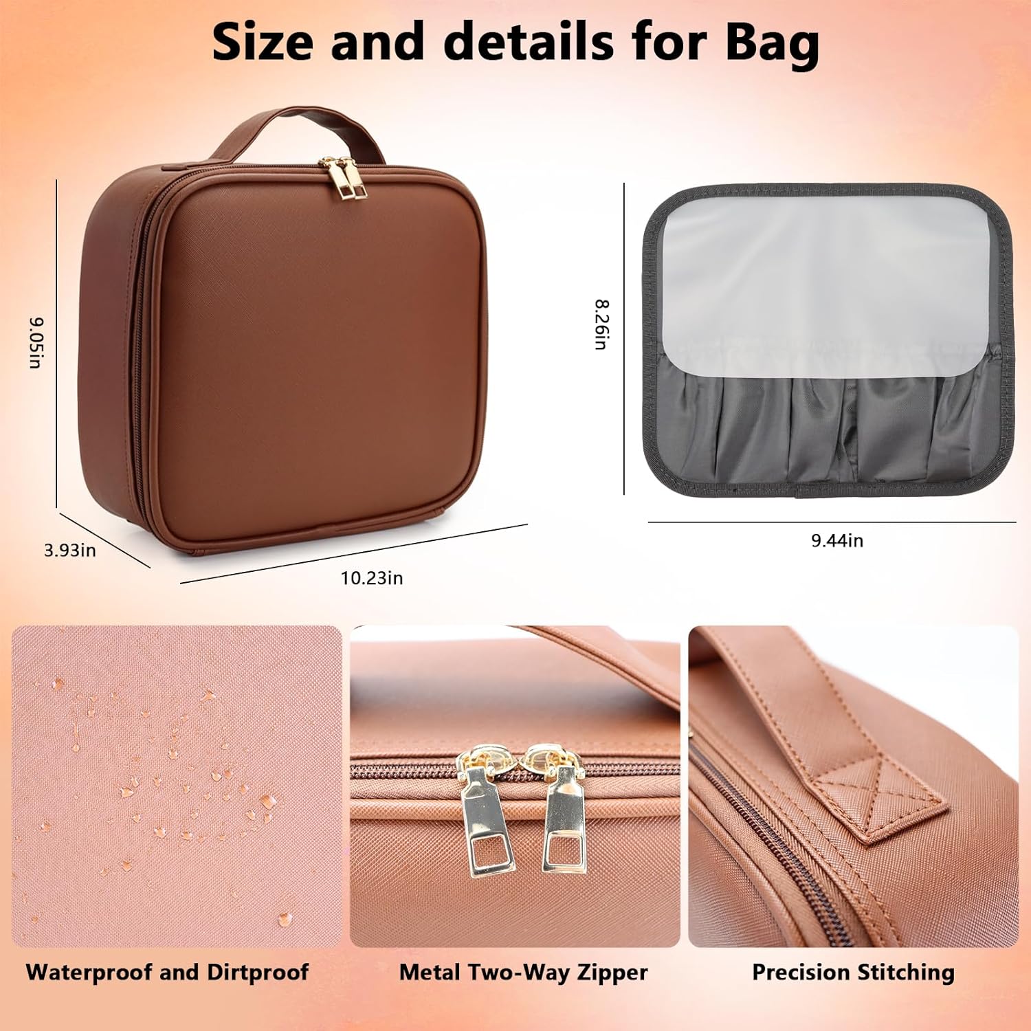 Travel Makeup Bag with LED Mirror Travel Makeup Organizer with 3 Lighted Settings, Adjustable Dividers and Makeup Brush Storage Bag Dark Brown