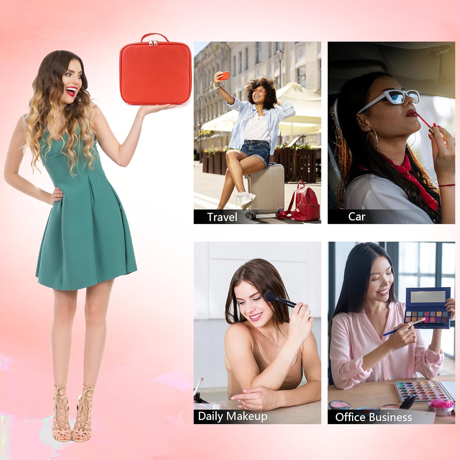 Travel Makeup Bag with LED Mirror Travel Makeup Organizer with 3 Lighted Settings, Adjustable Dividers and Makeup Brush Storage Bag Red