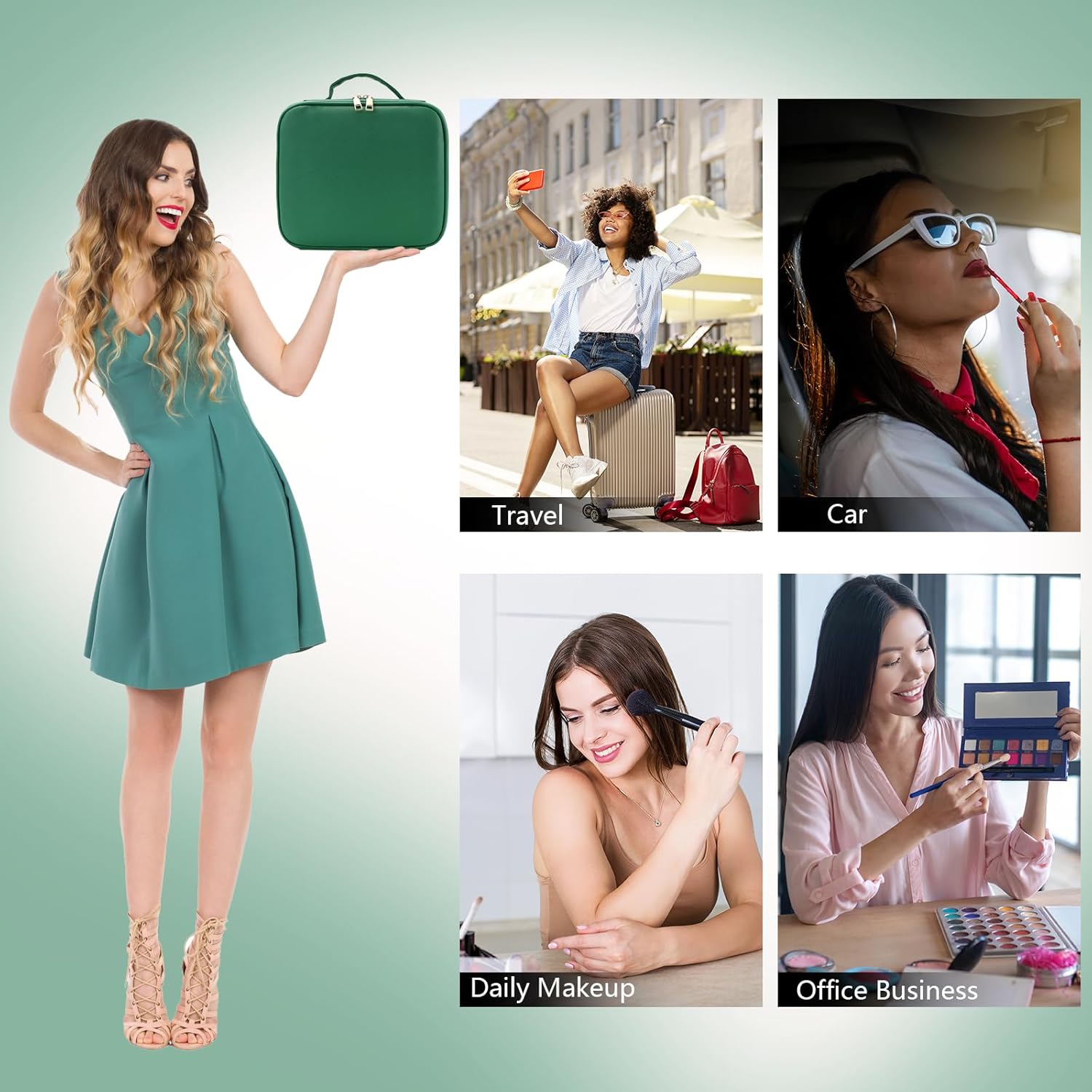 Travel Makeup Bag with LED Mirror Travel Makeup Organizer with 3 Lighted Settings, Adjustable Dividers and Makeup Brush Storage Bag Dark Green