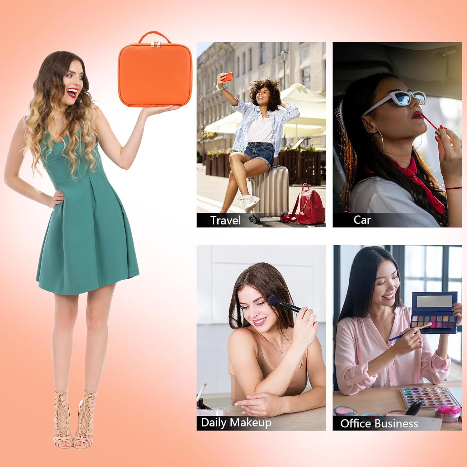 Travel Makeup Bag with LED Mirror Travel Makeup Organizer with 3 Lighted Settings, Adjustable Dividers and Makeup Brush Storage Bag Orange