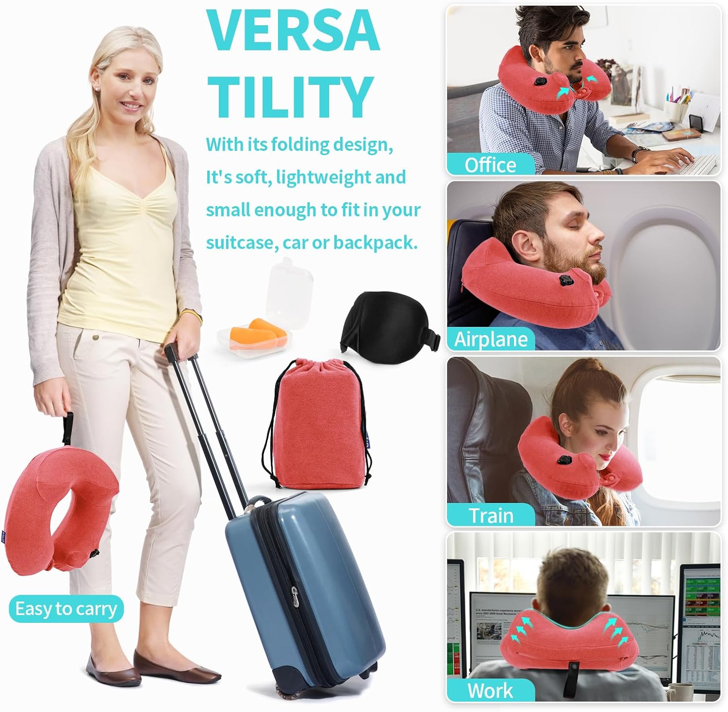 Inflatable Travel Neck Pillow for Airplane, Head Support Velvet Adult Neck Pillow for Long Flight, Kit with Eye Mask, Earplugs and Storage Bag,1, Rose Pink