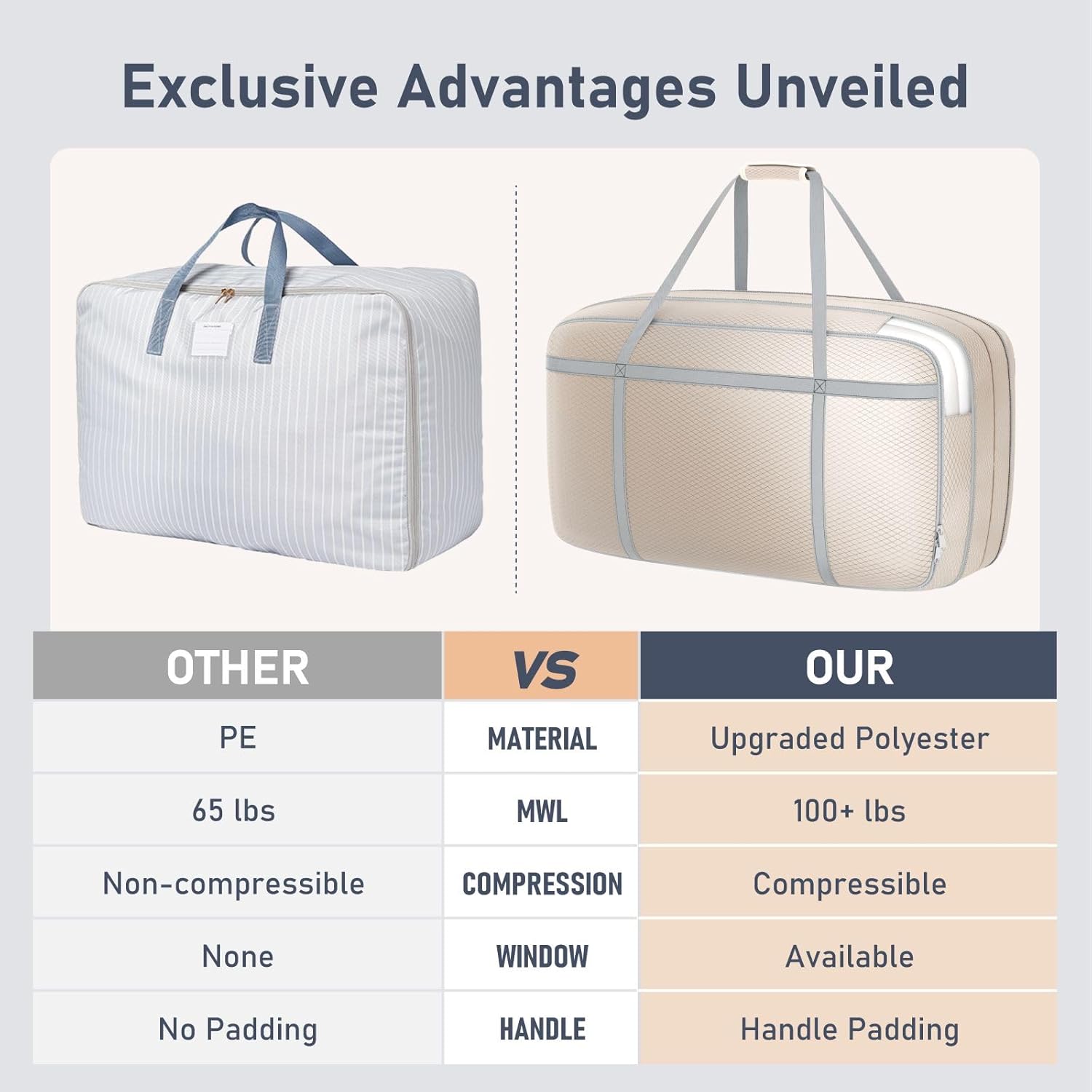 - [Spacious Multi-Scenario Moving Totes] Whether you're moving to a new home, organizing winter clothes, or heading off to college, these compression packing bags are a must-have. Perfect for storing everything from pillows, toys, towels, and decorations to laundry, they fit neatly in closets, garages, or utility rooms for clutter-free storage. Our blanket storage bags compresses from 27.55'L × 15.74'W × 14.17'H to 27.55'L × 15.74'W × 9.44'H