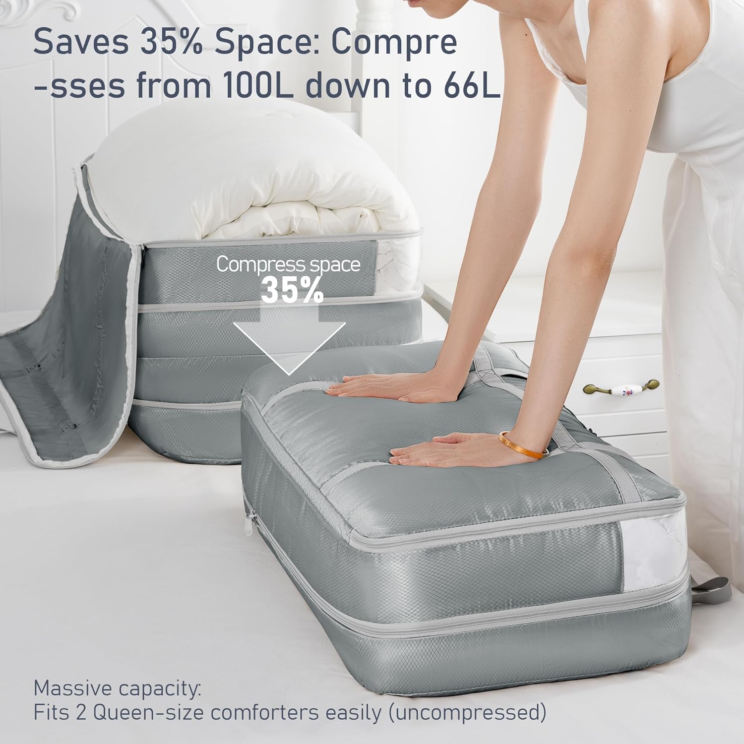 - [Spacious Multi-Scenario Moving Totes] Whether you're moving to a new home, organizing winter clothes, or heading off to college, these compression packing bags are a must-have. Perfect for storing everything from pillows, toys, towels, and decorations to laundry, they fit neatly in closets, garages, or utility rooms for clutter-free storage. Our blanket storage bags compresses from 27.55'L × 15.74'W × 14.17'H to 27.55'L × 15.74'W × 9.44'H