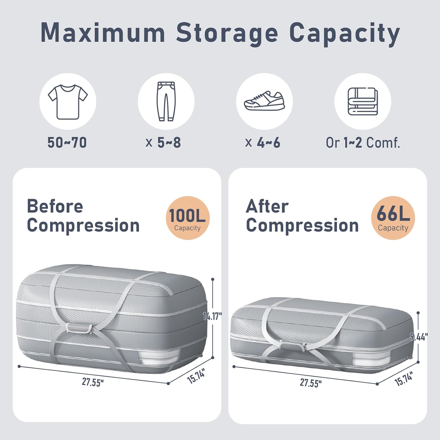 - [Spacious Multi-Scenario Moving Totes] Whether you're moving to a new home, organizing winter clothes, or heading off to college, these compression packing bags are a must-have. Perfect for storing everything from pillows, toys, towels, and decorations to laundry, they fit neatly in closets, garages, or utility rooms for clutter-free storage. Our blanket storage bags compresses from 27.55'L × 15.74'W × 14.17'H to 27.55'L × 15.74'W × 9.44'H