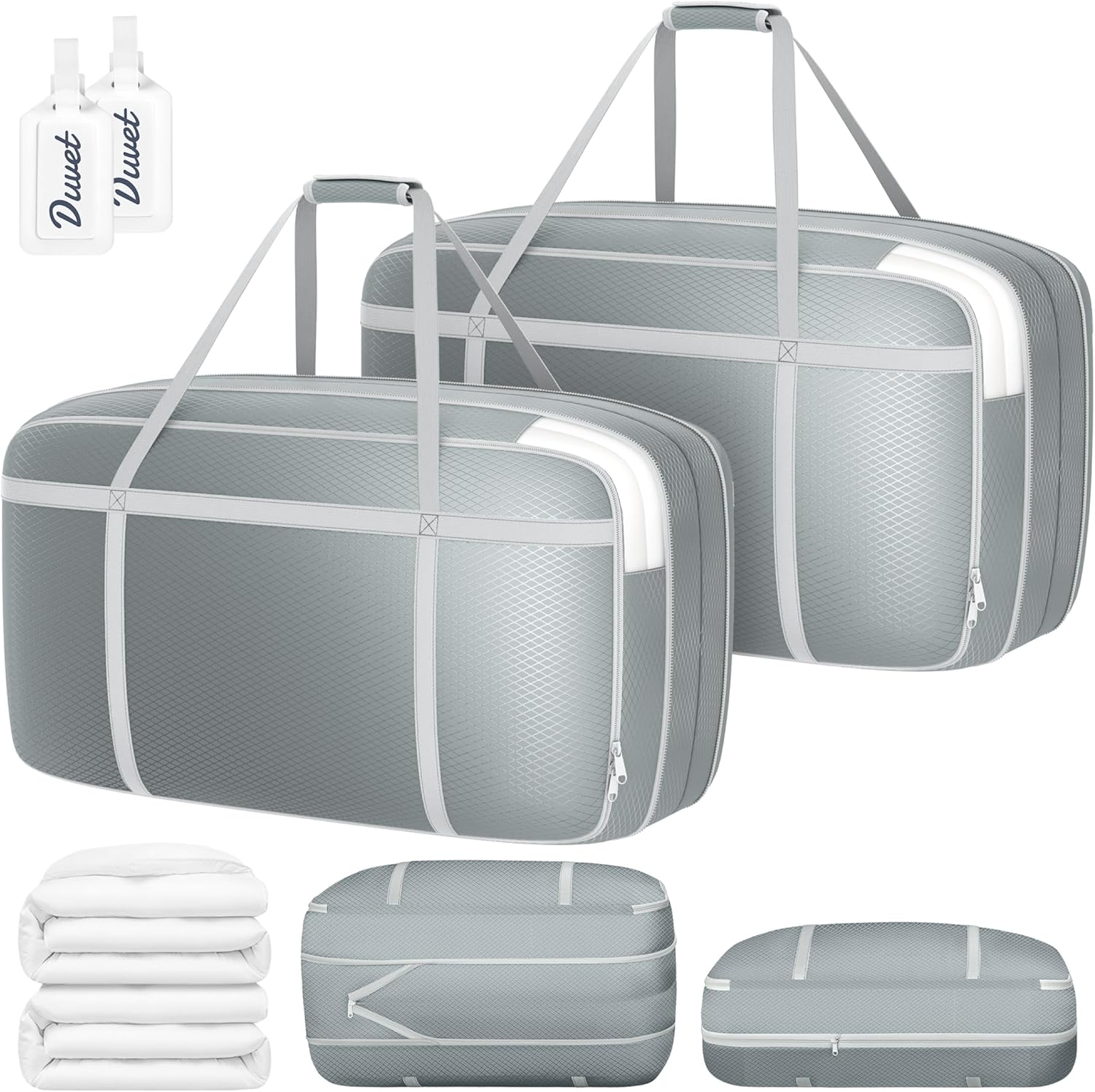 - [Innovative Compression Storage Bags] Simplify your storage routine with DIMJ’s ultra space-saving self compression organizer. Just fill the bag with your comforters, clothes, or cushions, zip it up, press to release air, and zip the center compression line to reduce its volume. Ideal for maximizing space in your college dorm, closet, or during travel, this comforter storage bag is a smart solution for organizing bedding and blankets