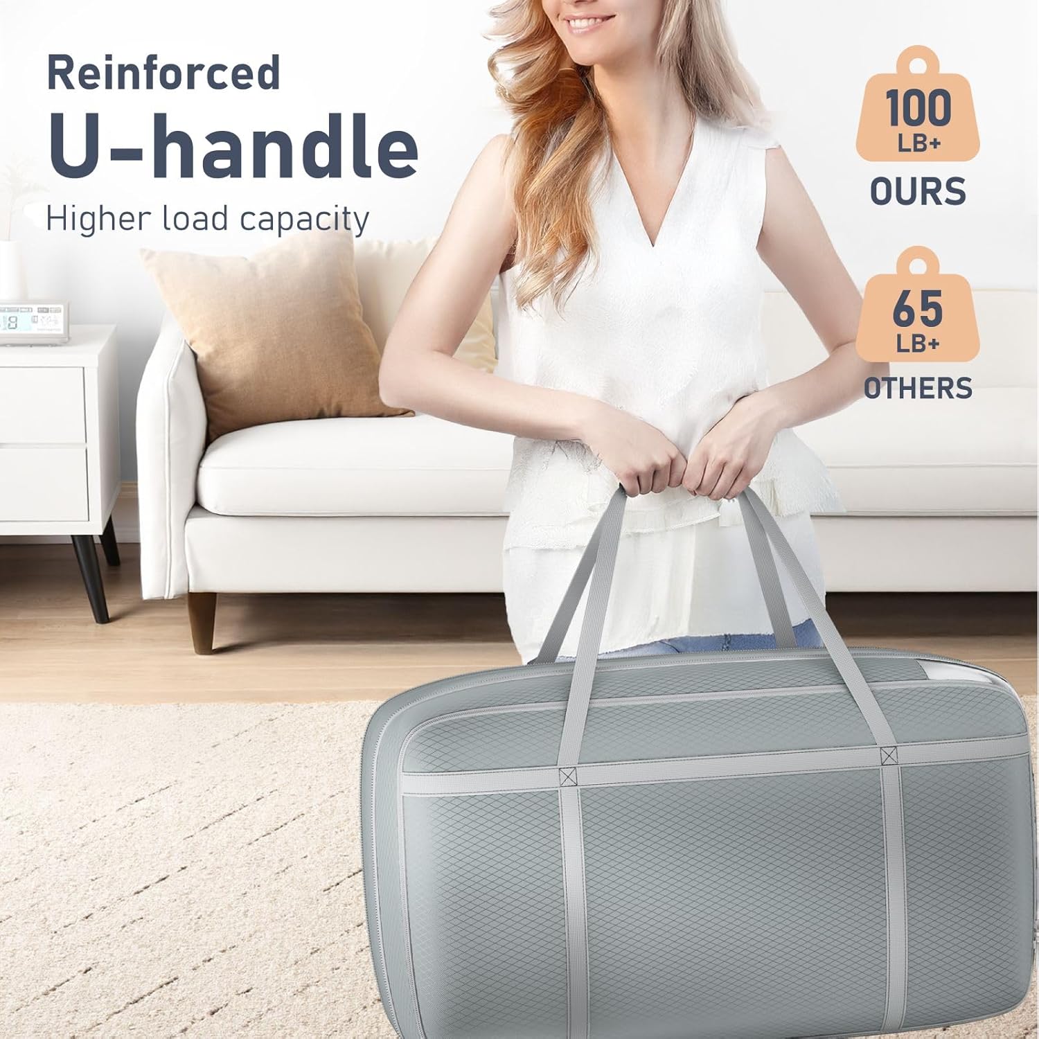 - [Reinforced Padded Handles for Comfortable Carrying] The ergonomic U-shaped handles with soft padding provide a comfortable grip even when fully loaded. Built with reinforced stitching across stress points, these 24 gallon bedding storage bag extra large heavy duty are perfect for moving supplies, packing, or laundry transport