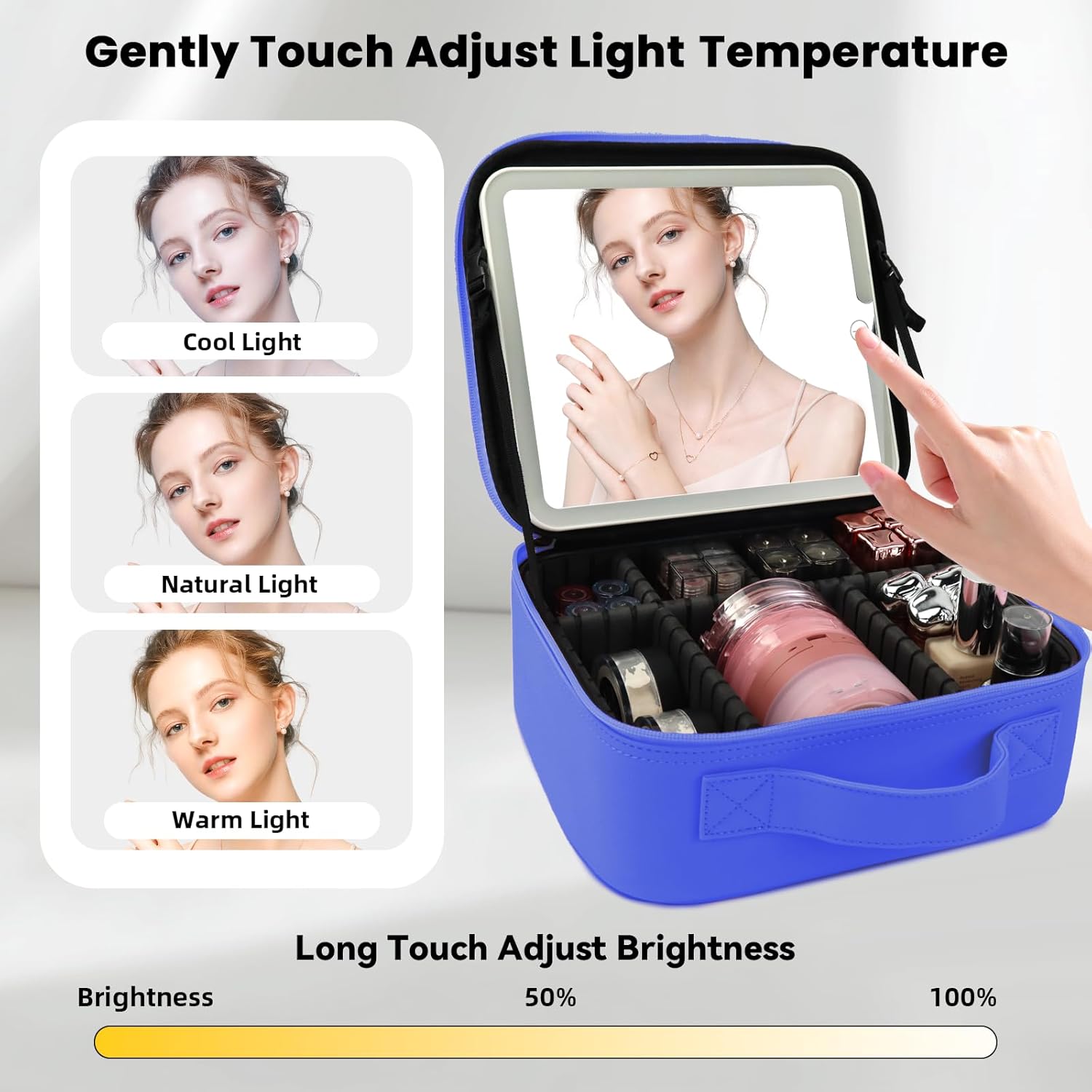 - 【Travel Makeup Bag with Led Mirror】Makeup case includes an 7.87 * 9in full-screen light mirror, Long press to control the brightness from 0% to 100% and gently touching the switch can easily adjust color temperature between cold light, natural light, and warm light, Can be attached to a makeup bag or placed on a desktop