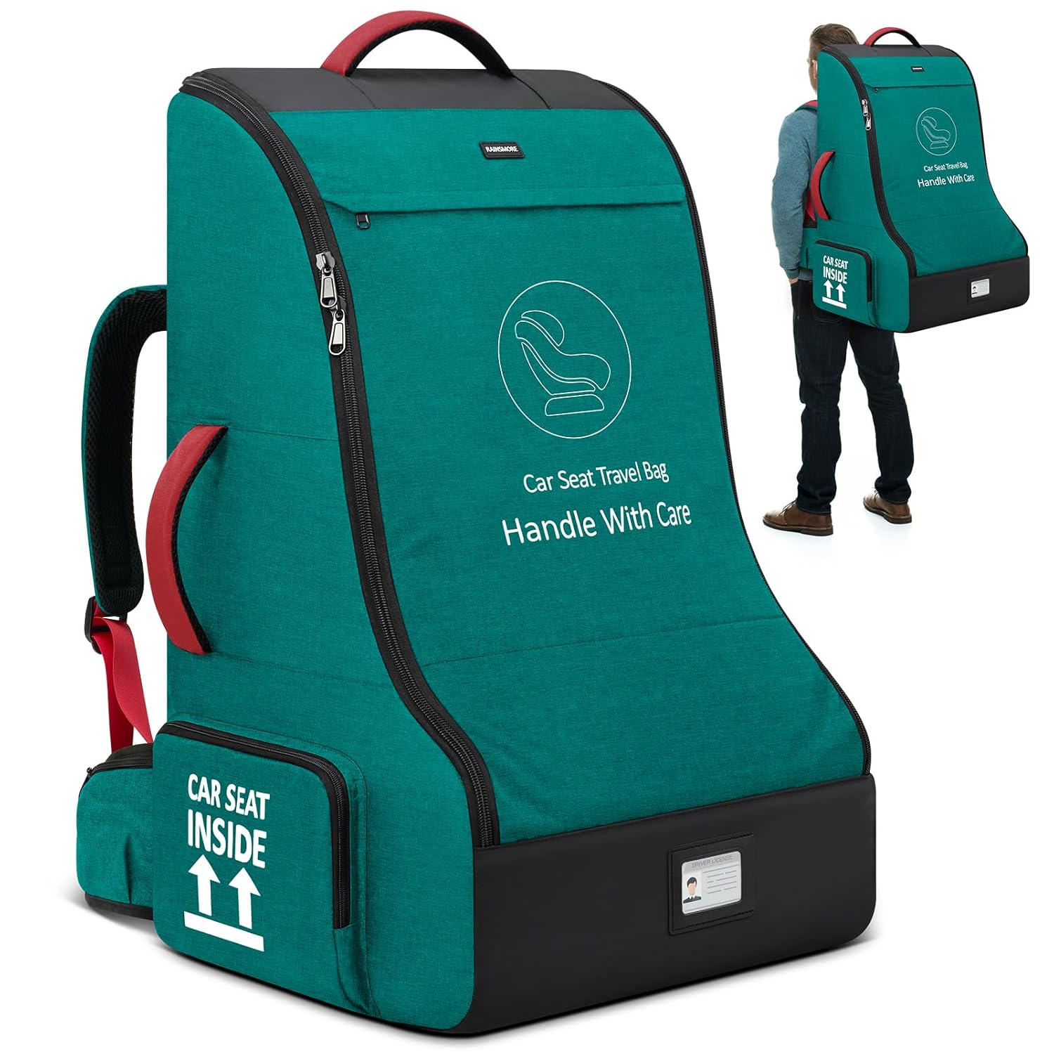 RAINSMORE Padded Car Seat Travel Bag for Airplane Heavy Duty Car Seat Backpack for Air Travel Baby Carseat Cover Bags for Airport Large Car Seats Carrier Fits Car Seats & Booster Seats, Green