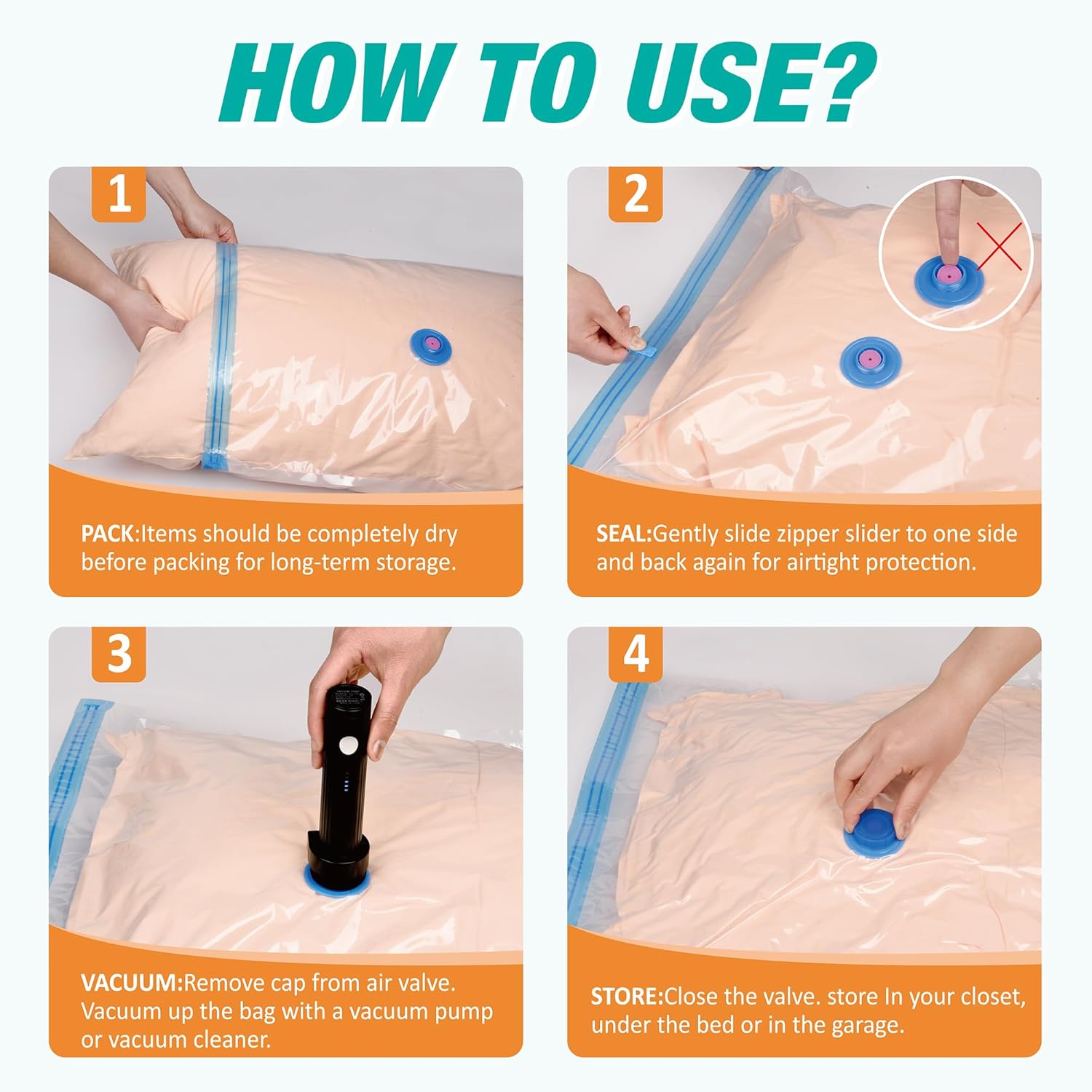 - Easy To Use & Store: Insert items, seal, and vacuum. You can place the compressed vacuum bag at any angle from standing upright in the closet to lying it in the suitcase for easy packing.