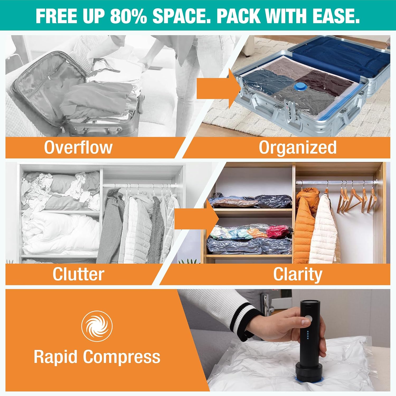 - Our Vacuum Storage Bags with Electric Air Pump is a travel must-have: Easily compress items on the go with our electric vacuum pump and reduce original volume by 80% in a faster way. Essential for travel, home organization, and moving. Store your clothes, bed sheets, blankets, and many more!
