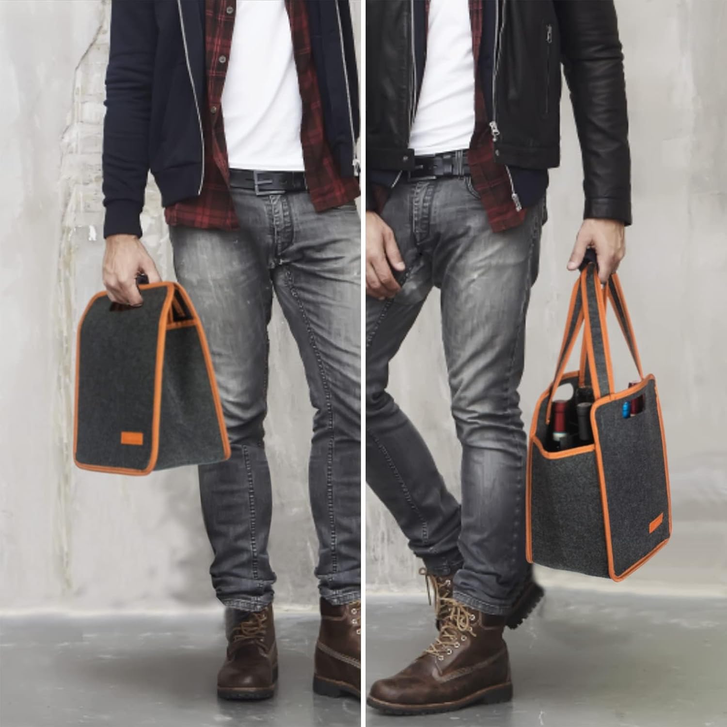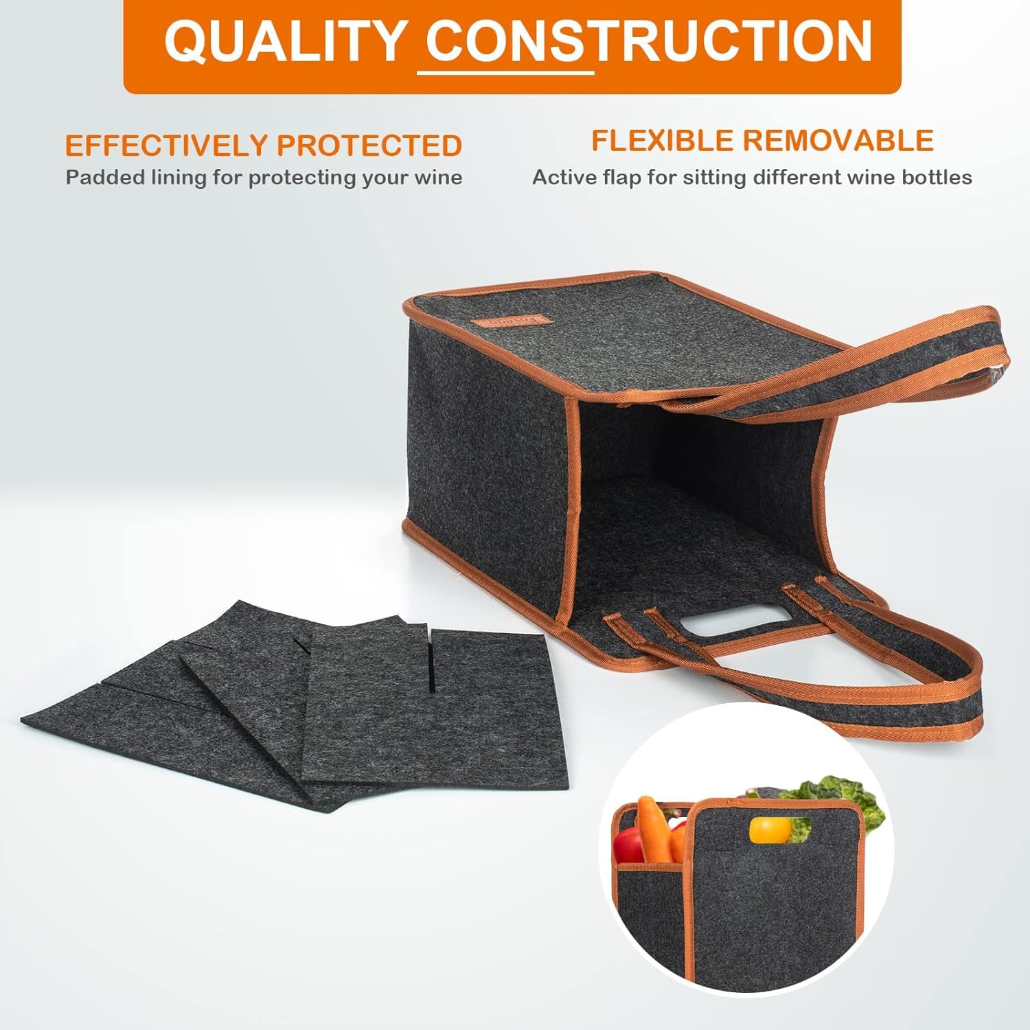 - đˇăHIGH-QUALITY WINE CARRIERă: Wine tote bags for 6 wine bottles are made of beautiful and durable high-quality felt. Different from other products on the market, special edge treatment is performed around our wine carrier, which is stronger and prettier. The strong handle, thick padded & thermal insulated material and adjustable shoulder strap make it the perfect wine carrier for outdoor activities.