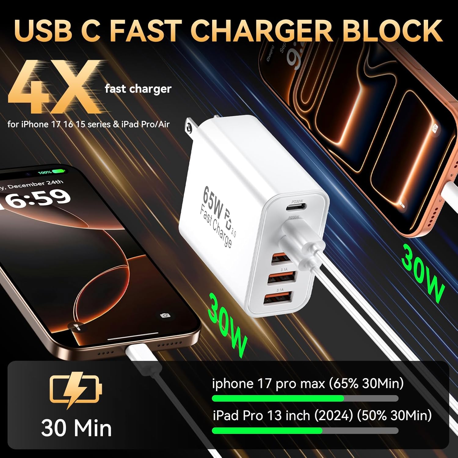 - 2-Pack 65W Fast Charger Block for iPhone 17 16 15 pro max -- A 6-port usb c Wall Charger block featuring 3 USB-C ports and 3 USB-A ports for efficient charging,The PD 3.0 USB-C port delivers a maximum power output of 30W, the QC 3.0 USB-A port provides a maximum power output of 18W, and the total combined power output reaches 65W. Usb c charging block offers fast and efficient charging up to 4X faster than a standard charger block. Charge for iPhone 17/16/15/14 series devices from 0% to 65% in just 30 minutes.