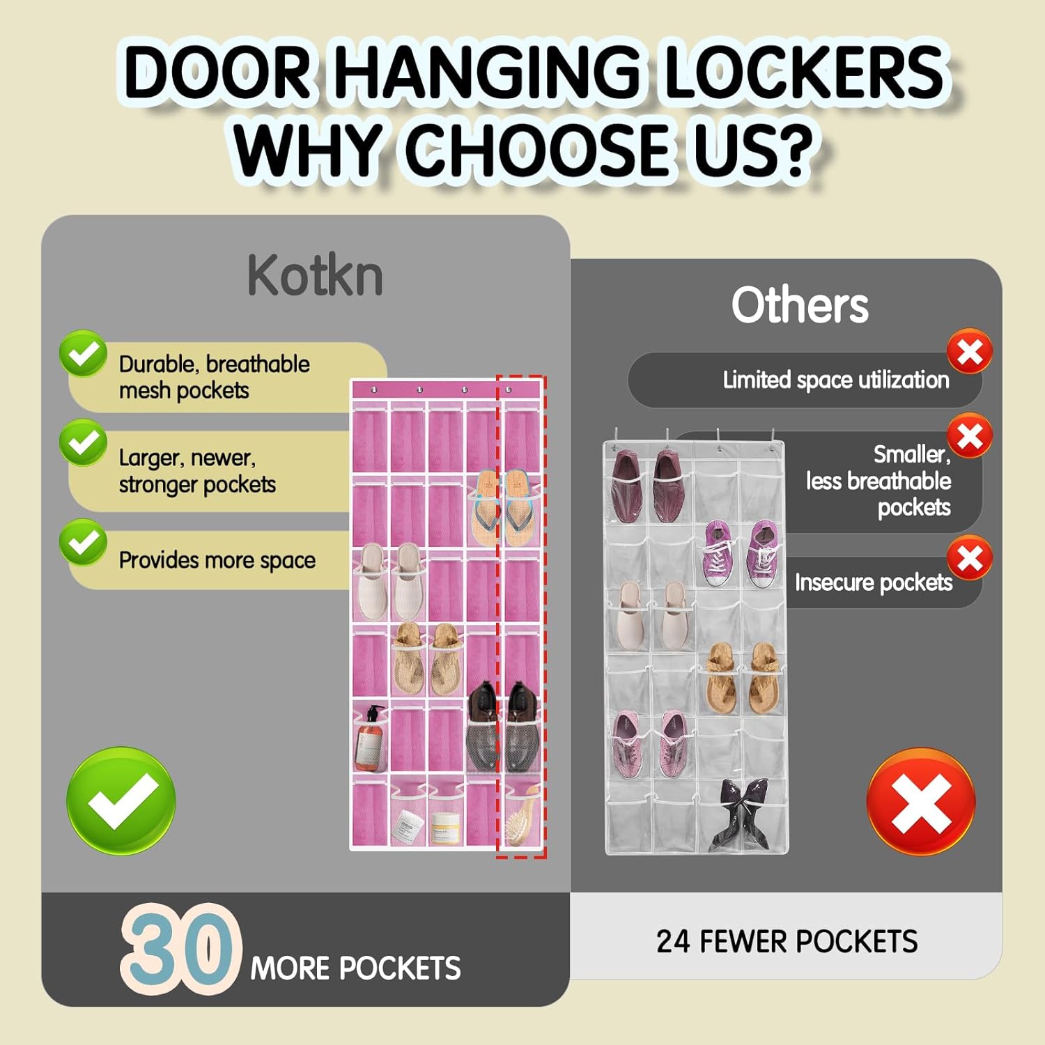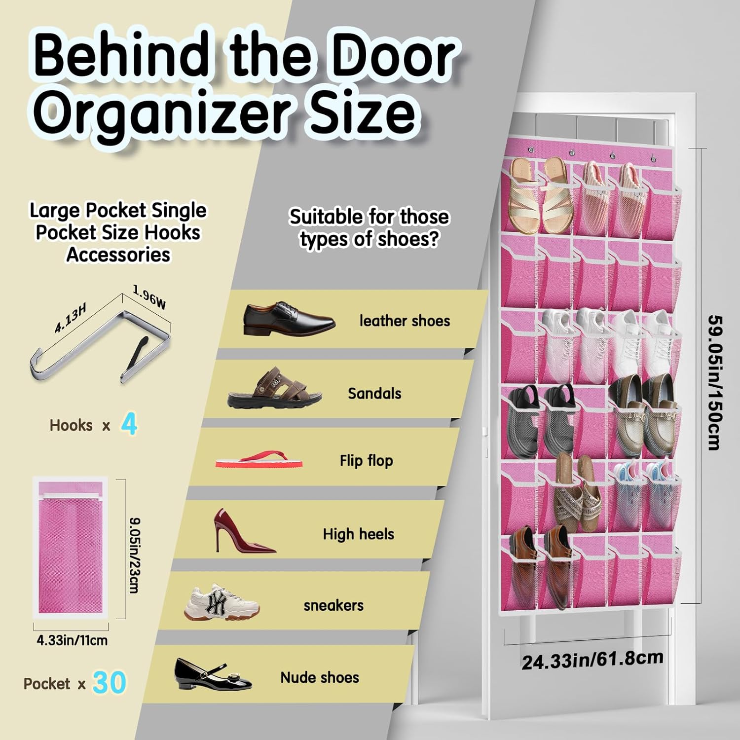- 👡【30 COMPARTMENT DOOR SHOE RACK SIZE】: This is compared with other 24 compartment and 28 compartment door hanging shoe organizer, the whole hanging shoe rack measures 68.7"(L) x 25.6."(W), 30 pockets, each pocket measures 9.5 "H X 5.1 "W X 11 "D. It's breathable and dries quickly. No need to worry about odor and mold. Enough space and deepened pockets, each pocket can hold 1 pair of slippers, children's shoes, flats or sandals or 1 pair of men's size 13 shoes.