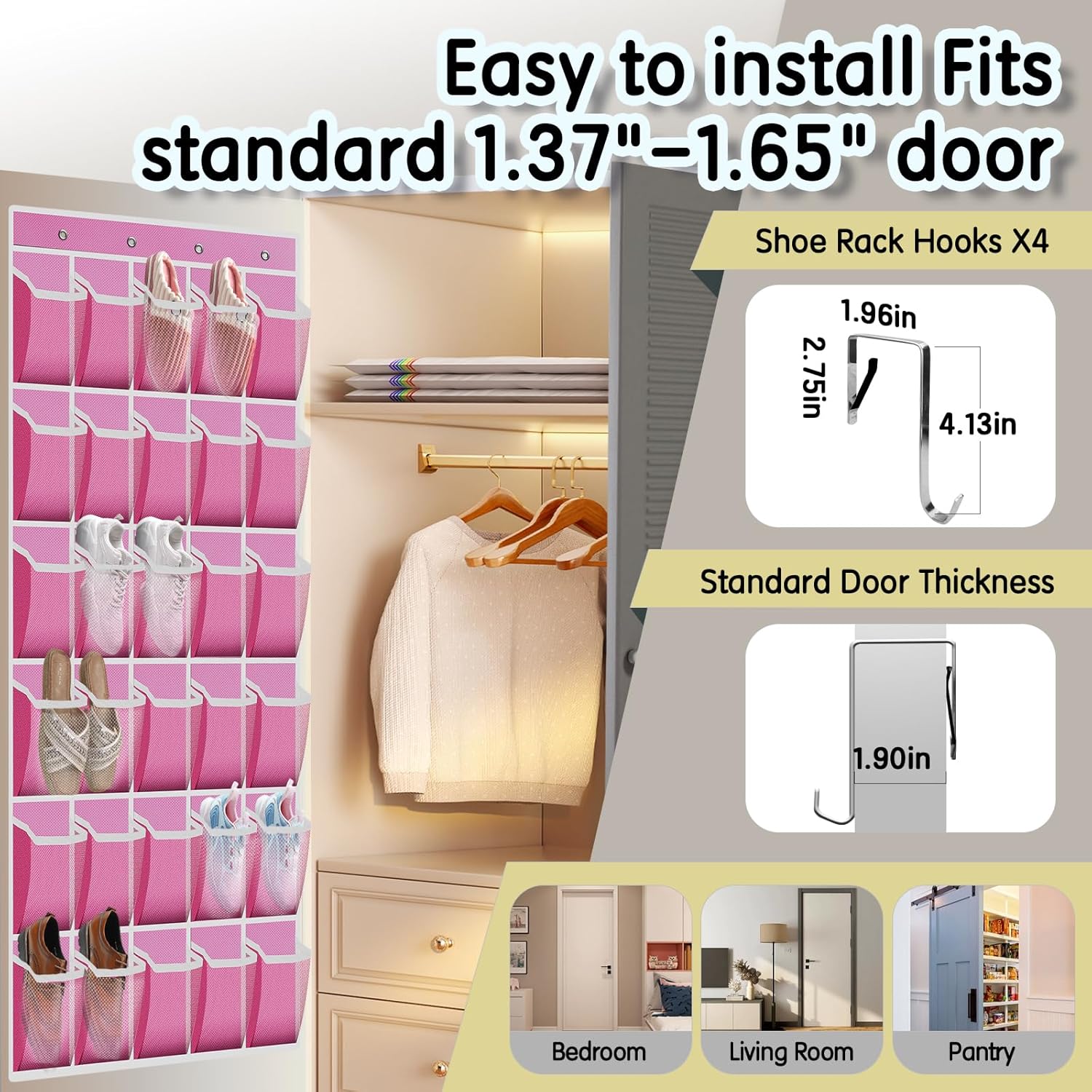 - 🥾【USE IN MULTIPLE SCENARIOS ACCORDING TO YOUR LOCATION】: This hanging shoe bag can be used not only in these places kitchen, baby room, bathroom, closet, foyer, bedroom, but also in pantry door, hall closet door, locker door, bi-fold door in your home, campsite, cruise ship, college dorms, classroom, traveling. Shoe rack includes 4 non-slip durable hooks, adjustable to fit doors 1.35"-1.95" thick, fits most doors perfectly.