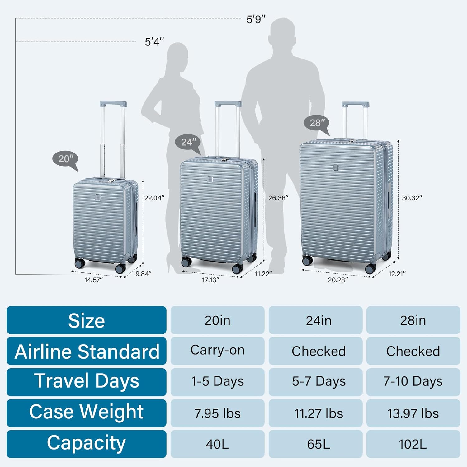 - 【Ergonomic Carry & Adjustable Telescoping Handle】In addition to regular grip from top / side handle, our lightweight luggage with spinner wheels allows jointly grasping top / bottom handles with both hands to lift suitcase, where convenience and ease stand out when putting into the car trunk or airplane overhead cabin. Besides, 4 side bumper feet protect the heavy duty luggage bottom from wear or dirt, and retractable luggage handle can be adjused in various heights for users of all statures.