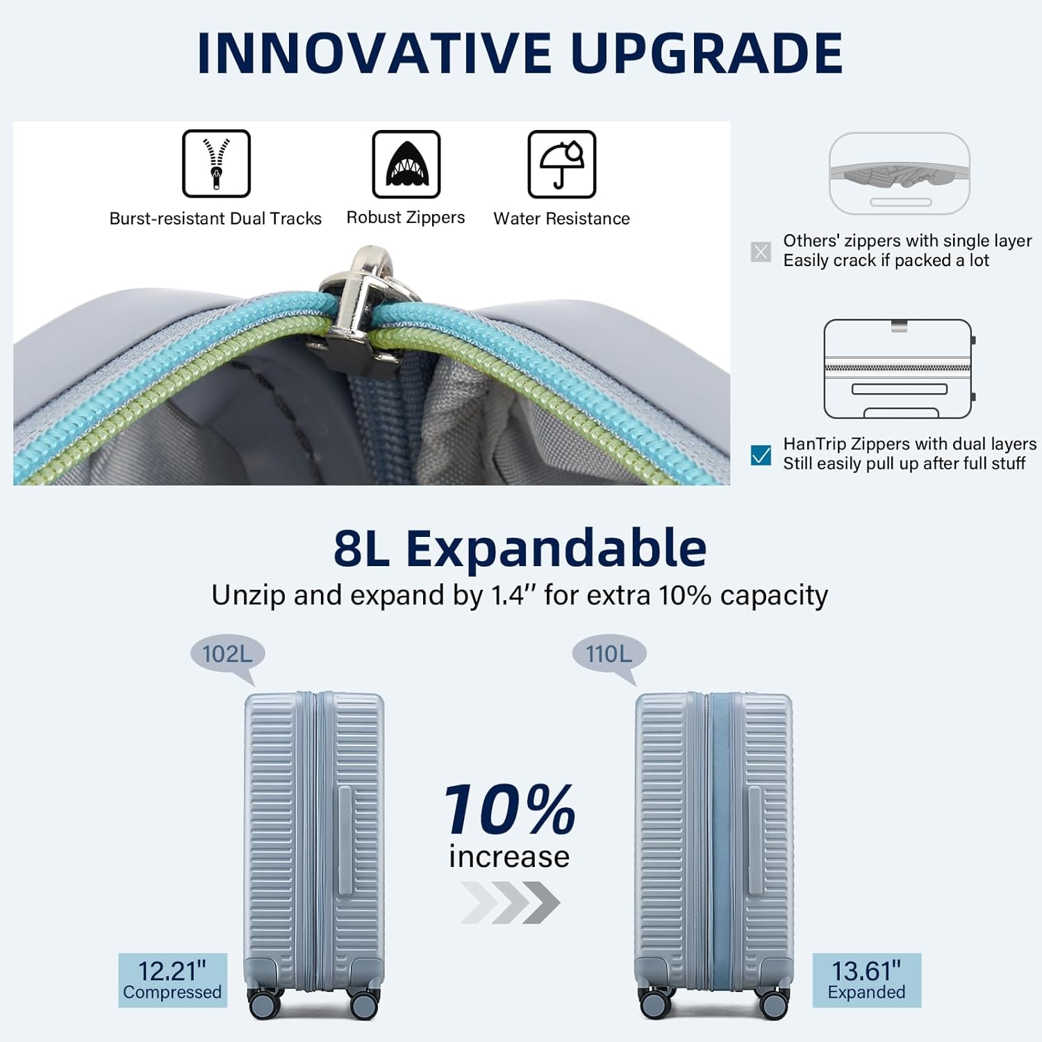- 【Expandable Luggage Maximized Space】Measuring 30.32×20.28×12.21 inch (77×51×31CM), the suitcases with wheels checked luggage boast a built-in power bank pocket, a wet / dry seperate zone and 2 big compartments, large capacity for 7-10 days’ personal items and travel essentials. For extra room, just unzippper and expand the suitcase by 10% space. Excellent large checked luggage for travelers of large capacity demand.