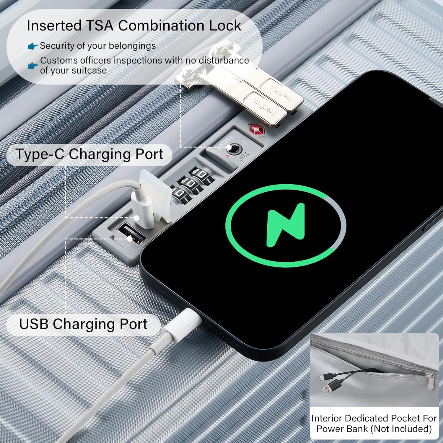 - 【Cup / Phone Holders & 2 Charging Ports】Large suitcases with wheels feature a universal cup holder for most water bottles, coffee mugs and tumblers. Retractable dual hooks securely hold various persoanl items like phone, iPad, U-shape throw pillow, handbag, etc (up to 11 lbs). Built-in charging ports allow on-the-go power access for Type-C / USB devices (portable power bank not included). Multifuncational silver luggage to set your hands free during layover at airport / train station.