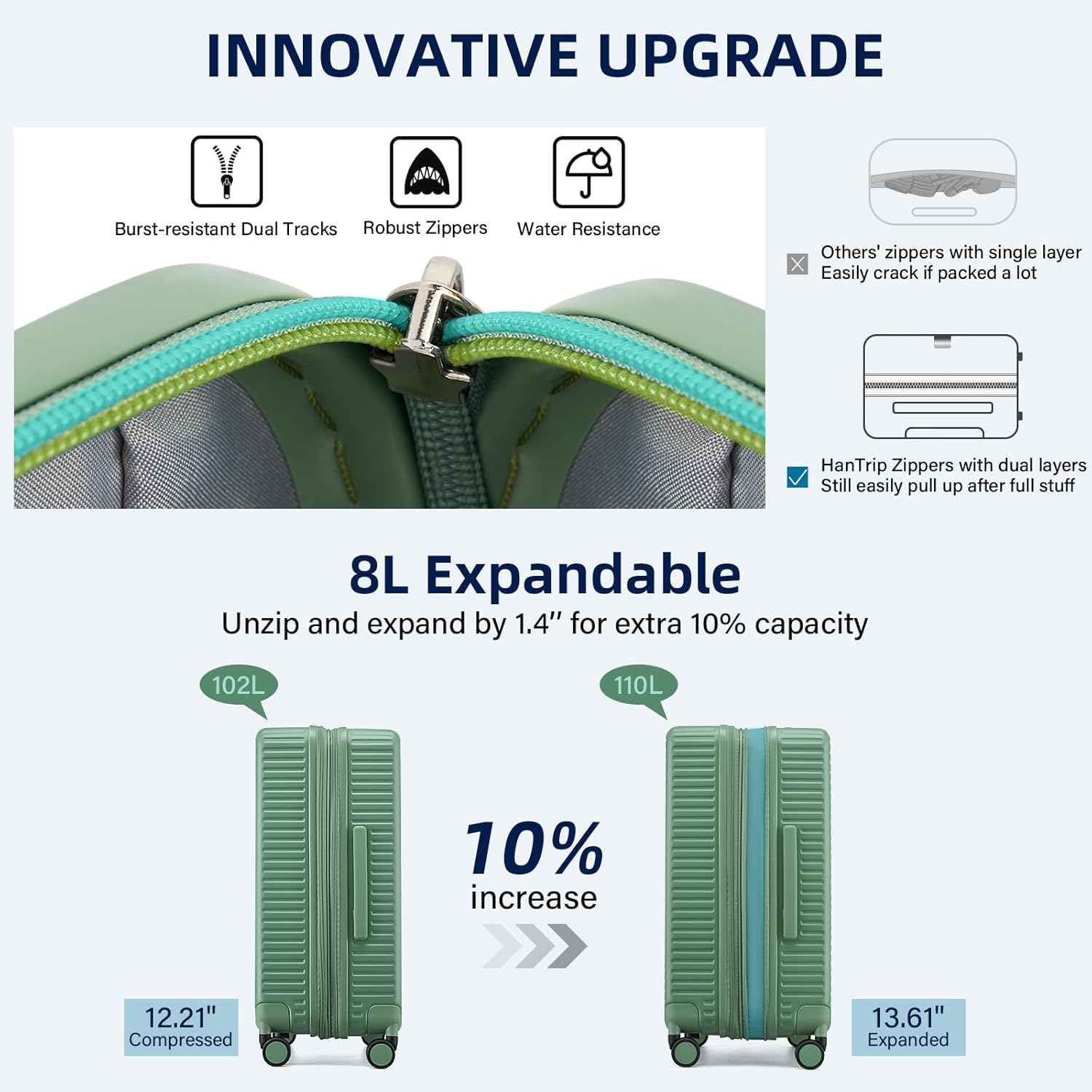 - 【Expandable Luggage Maximized Space】Measuring 30.32×20.28×12.21 inch (77×51×31CM), the suitcases with wheels checked luggage boast a built-in power bank pocket, a wet / dry seperate zone and 2 big compartments, large capacity for 7-10 days’ personal items and travel essentials. For extra room, just unzippper and expand the suitcase by 10% space. Excellent large checked luggage for travelers of large capacity demand.