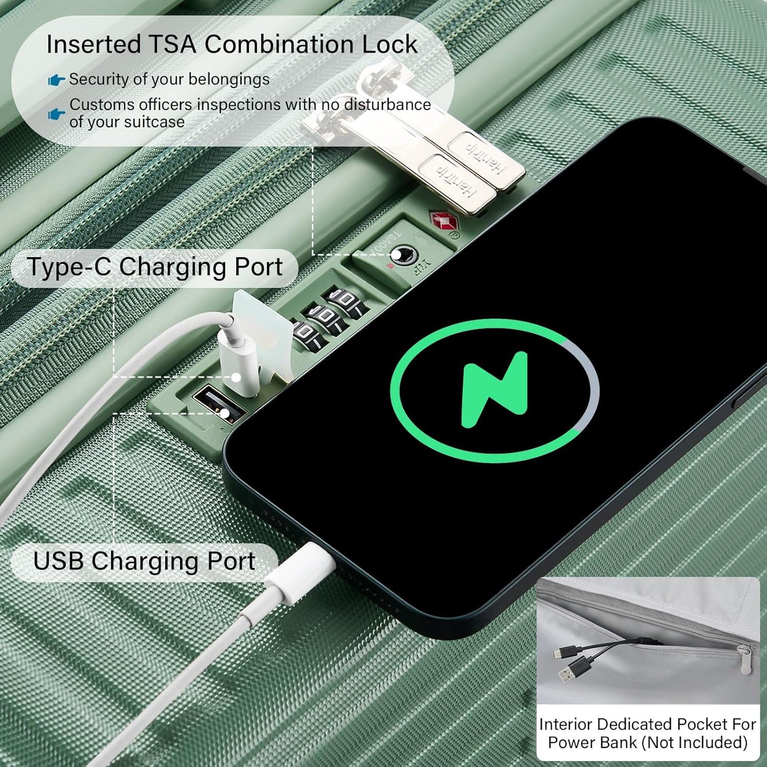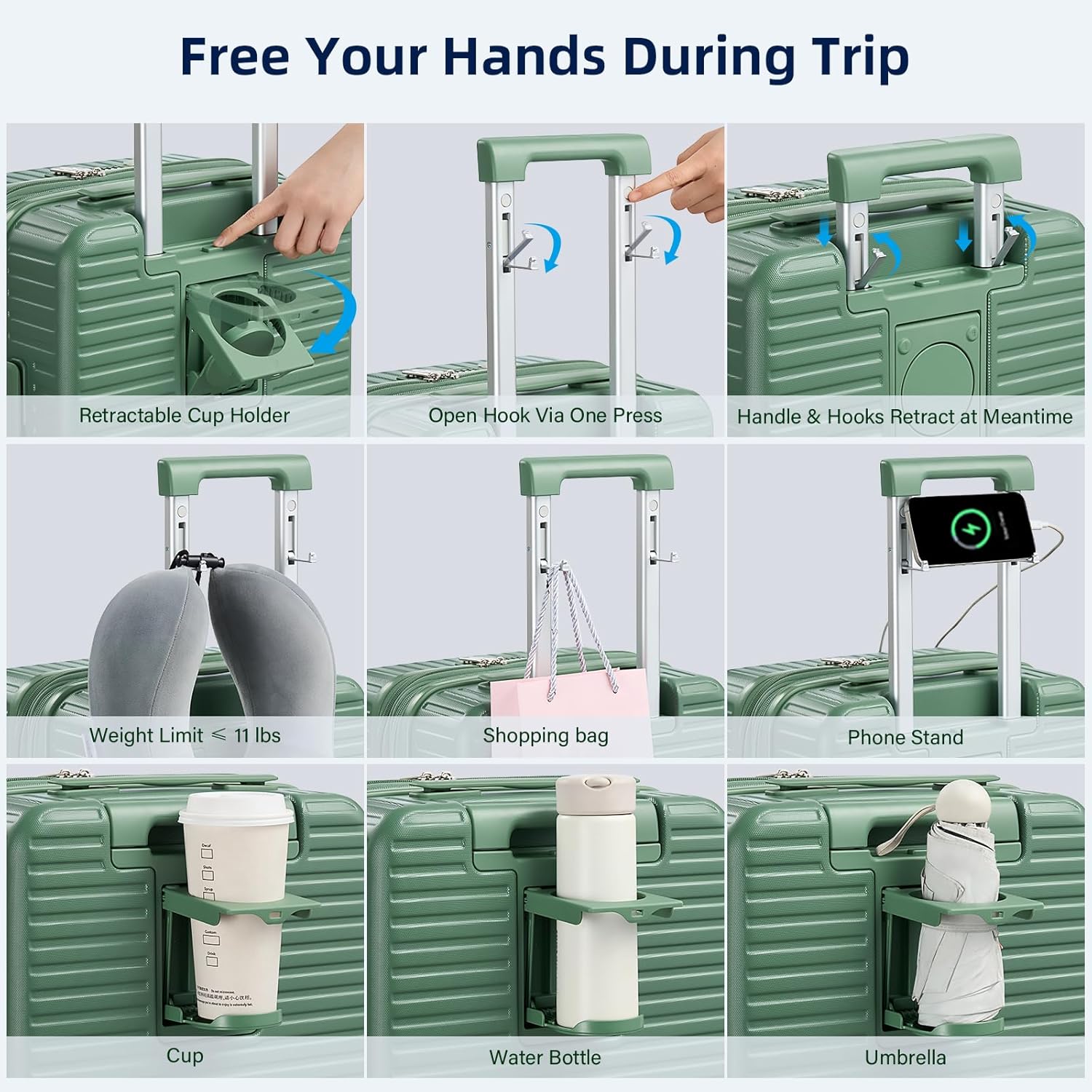 - 【Cup / Phone Holders & 2 Charging Ports】Large suitcases with wheels feature a universal cup holder for most water bottles, coffee mugs and tumblers. Retractable dual hooks securely hold various persoanl items like phone, iPad, U-shape throw pillow, handbag, etc (up to 11 lbs). Built-in charging ports allow on-the-go power access for Type-C / USB devices (portable power bank not included). Multifuncational green luggage to set your hands free during layover at airport / train station.