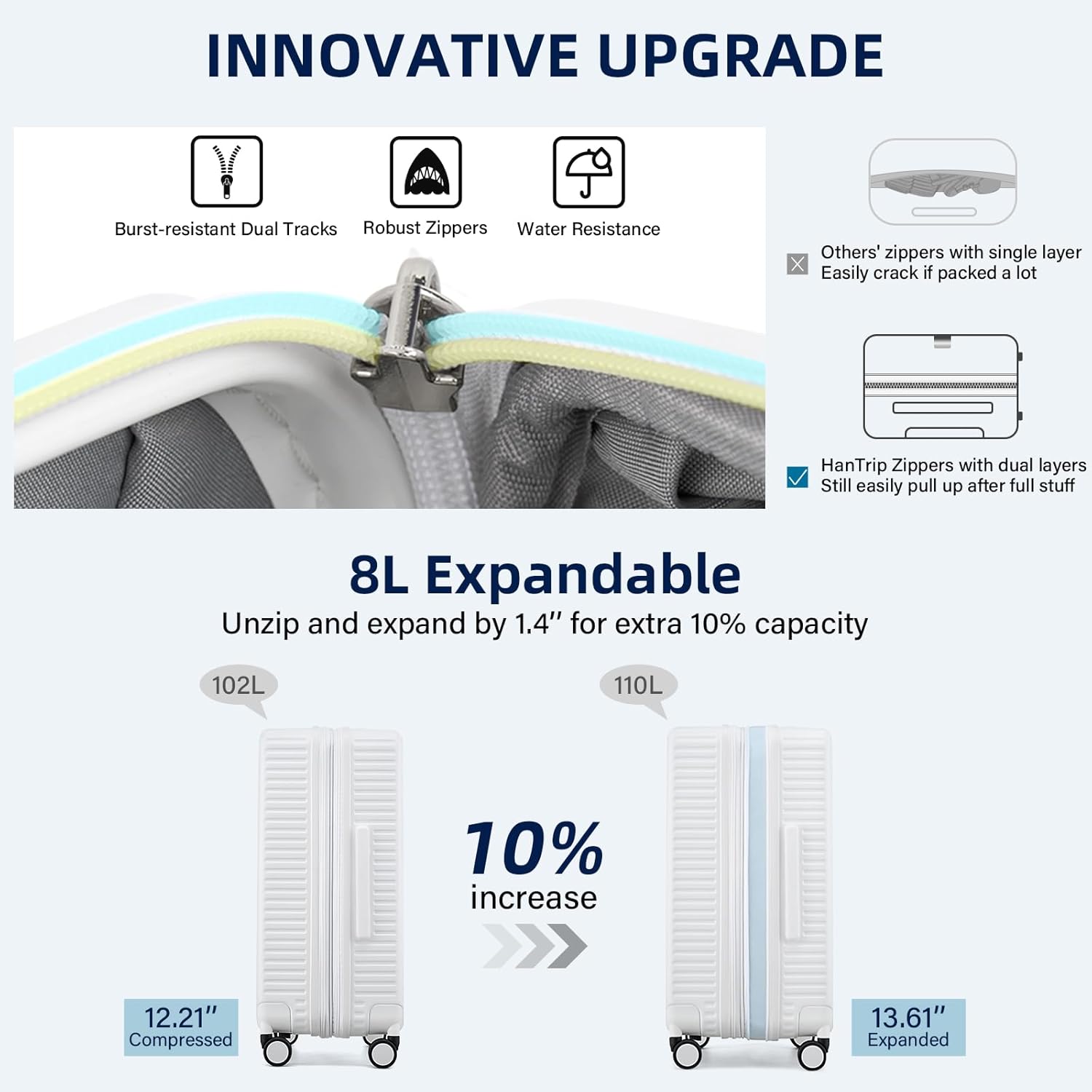 - 【Expandable Luggage Maximized Space】Measuring 30.32×20.28×12.21 inch (77×51×31CM), the suitcases with wheels checked luggage boast a built-in power bank pocket, a wet / dry seperate zone and 2 big compartments, large capacity for 7-10 days’ personal items and travel essentials. For extra room, just unzippper and expand the suitcase by 10% space. Excellent large checked luggage for travelers of large capacity demand.