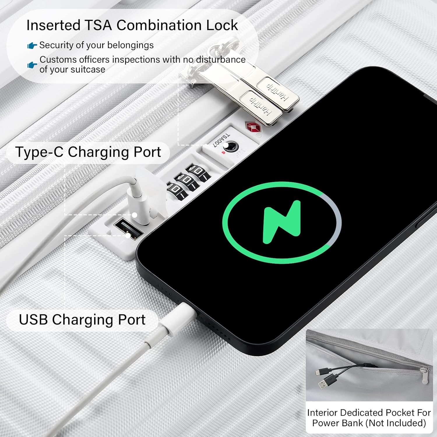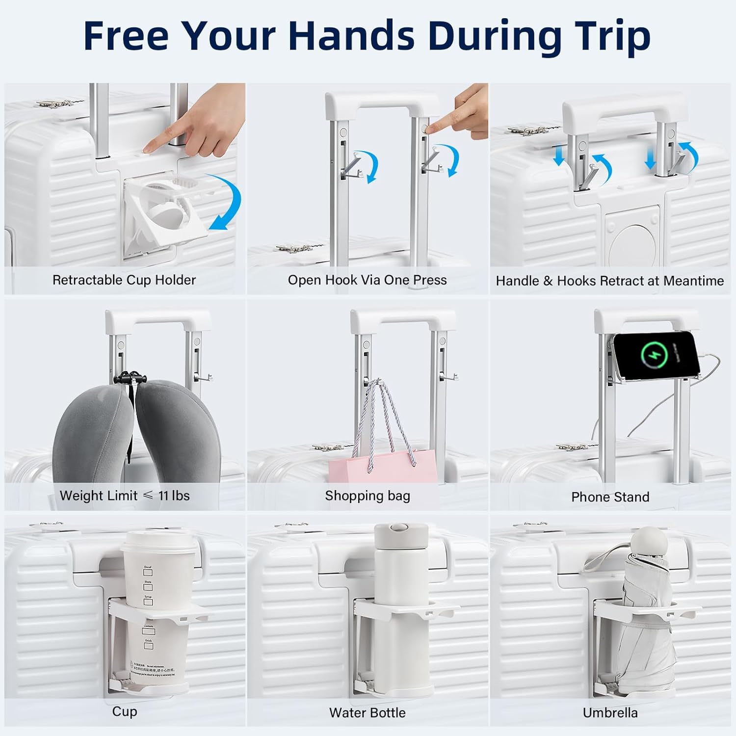 - 【Cup / Phone Holders & 2 Charging Ports】Large suitcases with wheels feature a universal cup holder for most water bottles, coffee mugs and tumblers. Retractable dual hooks securely hold various persoanl items like phone, iPad, U-shape throw pillow, handbag, etc (up to 11 lbs). Built-in charging ports allow on-the-go power access for Type-C / USB devices (portable power bank not included). Multifuncational white luggage to set your hands free during layover at airport / train station.