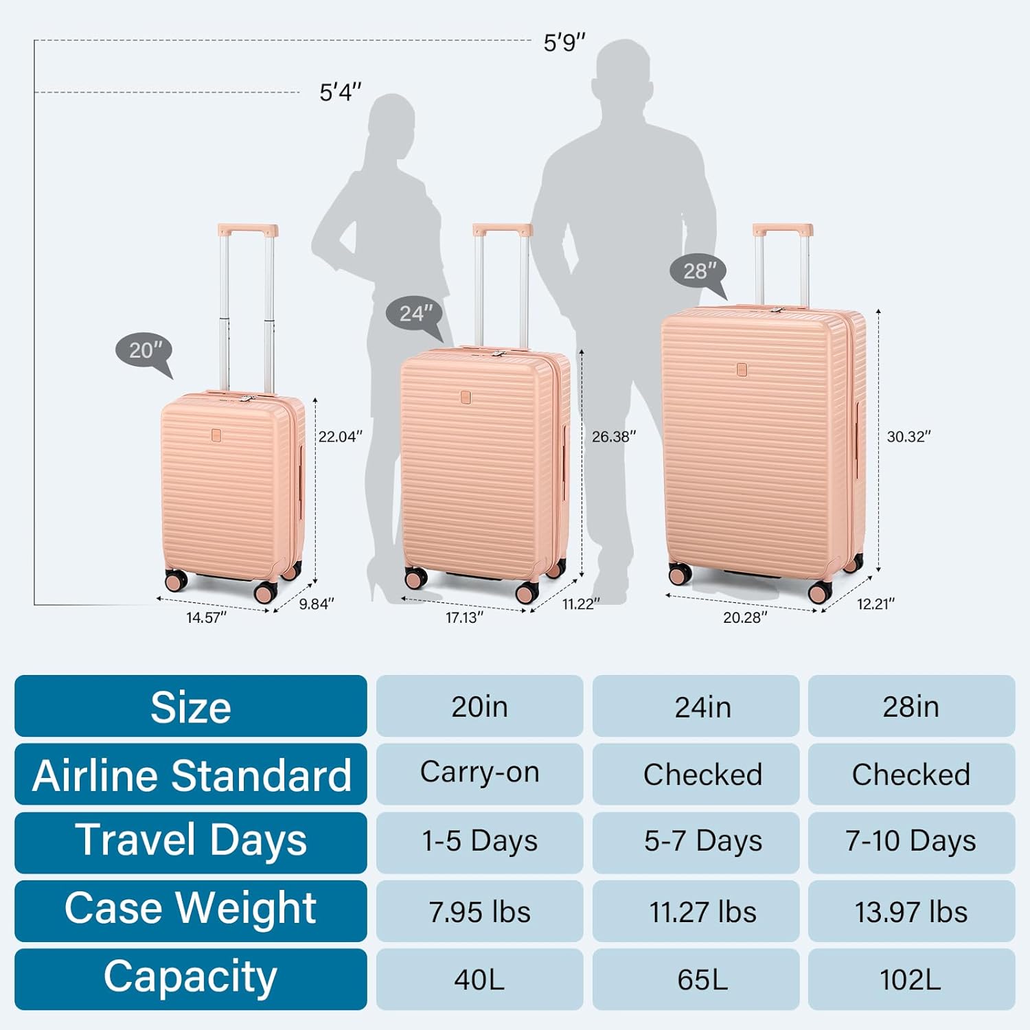 - 【Expandable Luggage Maximized Space】Measuring 26.38×17.13×11.22 inch (67×43.5×28.5CM), this luggage 24 inch boasts a built-in power bank pocket, a wet / dry seperate zone and 2 big compartments, large capacity for 5-7 days’ personal items and travel essentials. For extra room, just unzippper and expand the suitcase by 10% space. Excellent medium checked luggage for travelers of large capacity demand.