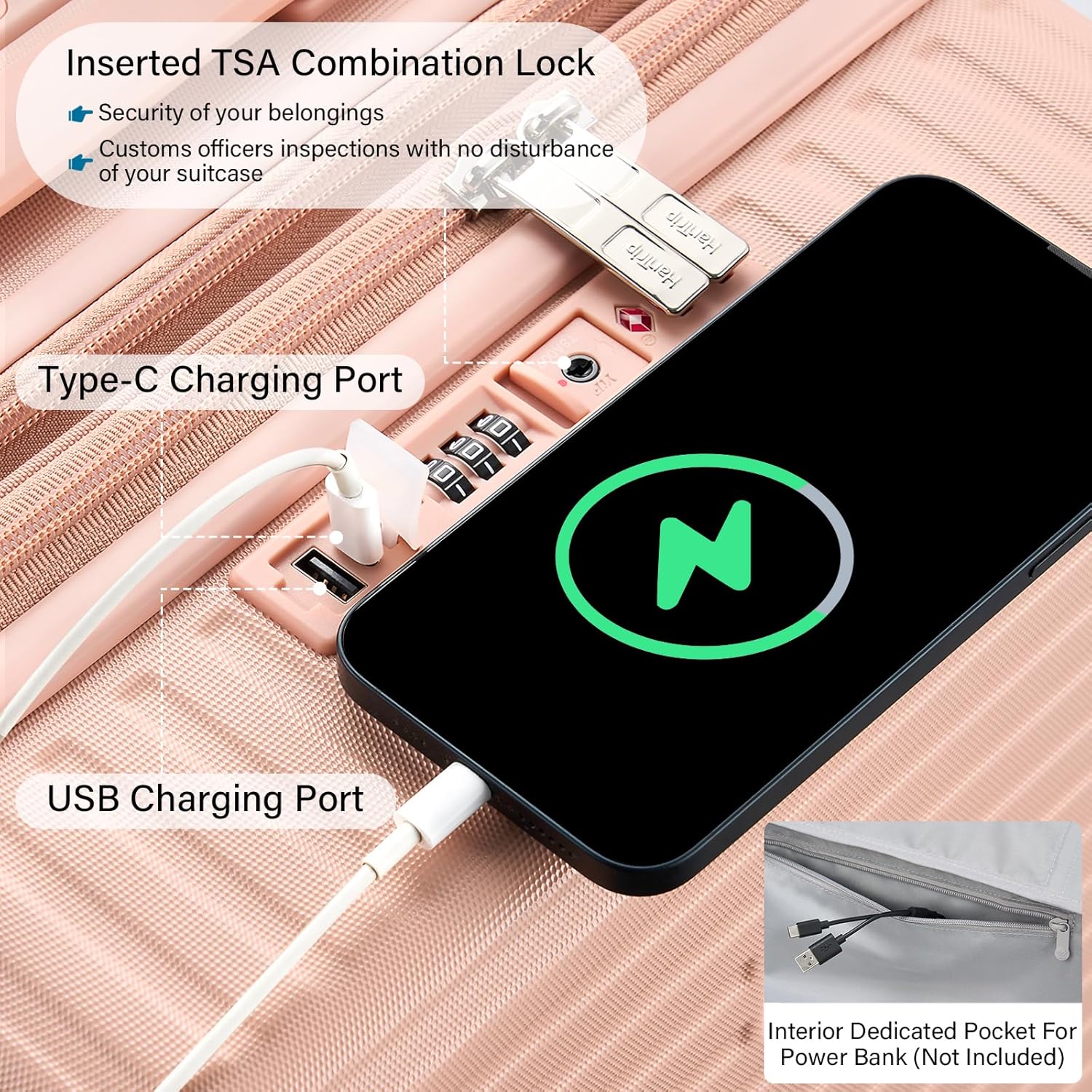 - 【Cup / Phone Holders & 2 Charging Ports】24 inch suitcase with spinner wheels fearures a universal cup holder for most water bottles, coffee mugs and tumblers. Retractable dual hooks securely hold various persoanl items like phone, iPad, U-shape throw pillow, handbag, etc (up to 11 lbs). Built-in charging ports allow on-the-go power access for Type-C / USB devices (portable power bank not included). Multifuncational pink luggage to set your hands free during layover at airport / train station.