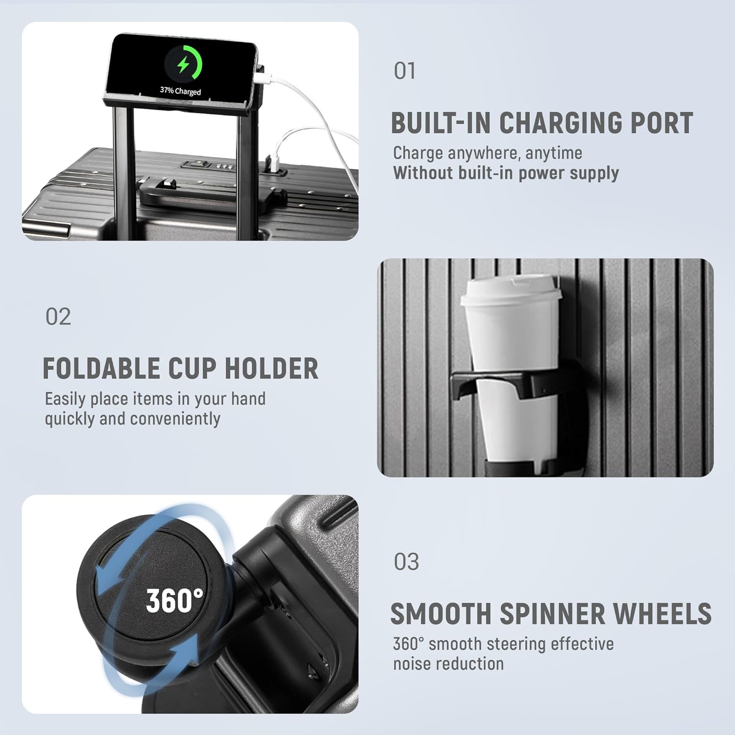 - 【Multifunctional】 Travel luggage includes USB and USB-C ports, cup holder design. USB and USB-C ports allow you to charge anytime and anywhere (the power bank is not included), and the back of 24 inch rolling suitcases with wheels is equipped with a stowable cup holder, so that you can easily enjoy a cup of coffee while traveling without having to worry about too much luggage.