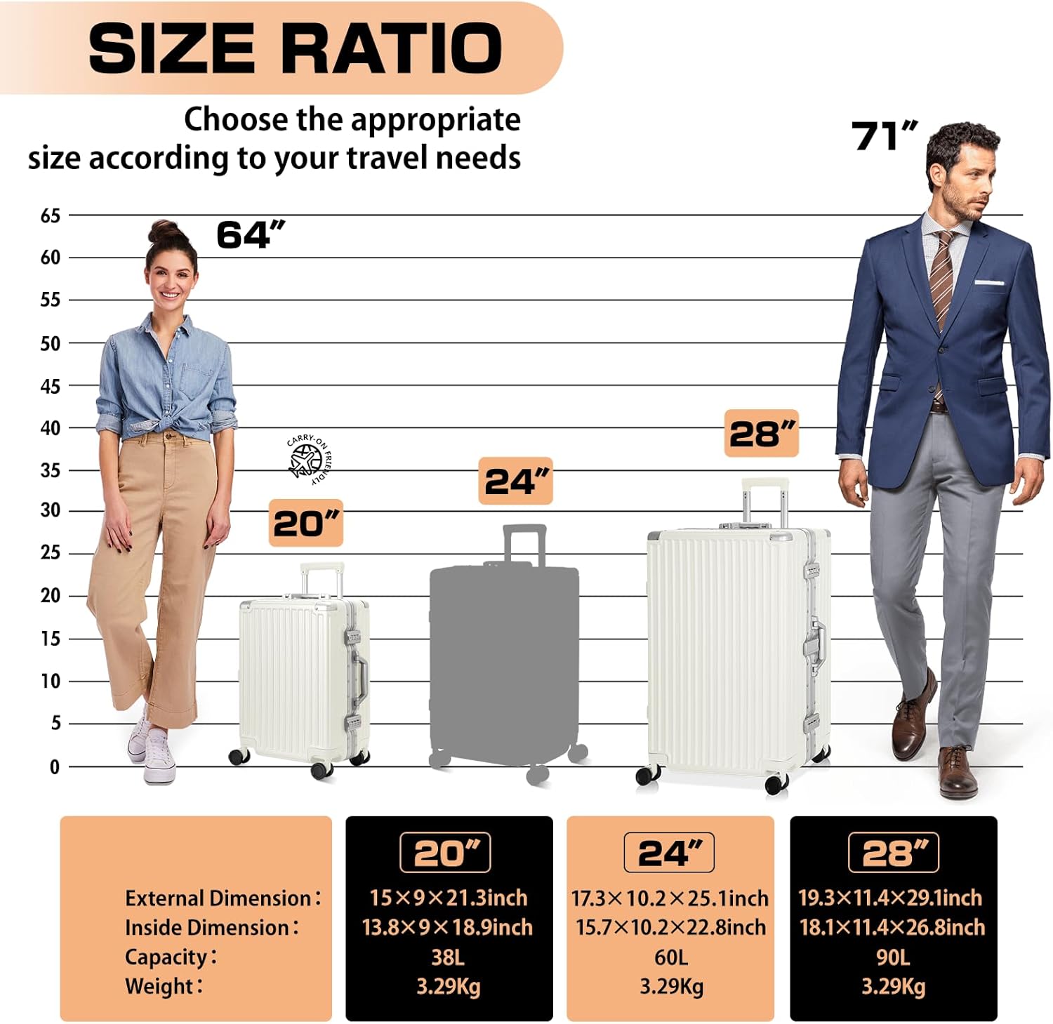 • 【Aluminium Luggage Sets】 20In Size: 15*9*21.3IN, Weight:3.29kg, Volume: 38L. 28In Size: 19.3*11.4*29.1IN, Weight:4.84kg, Volume: 90L.