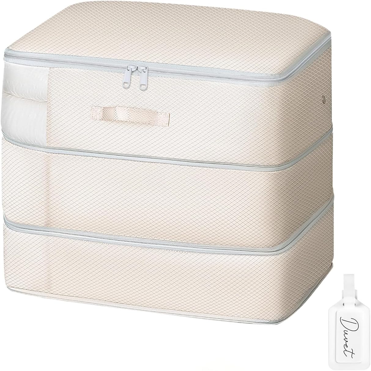 Comforter Storage Bag - Large Capacity Blanket Storage Bags 3-Layer Ultra Space Saving Self Compression Organizer, Washable Compression Bags for Storage Comforter Blanket, 1-Pack, Beige